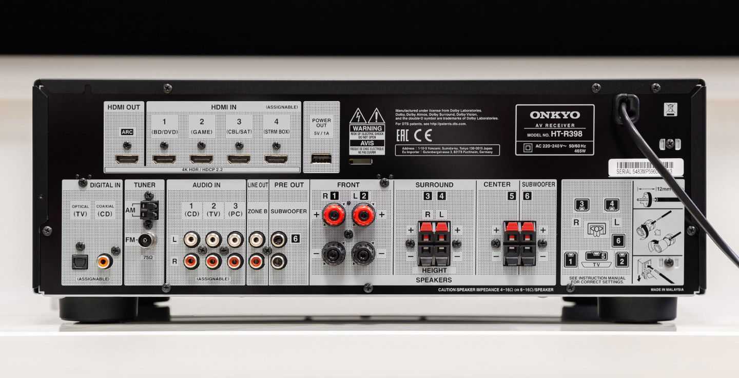Привычный набор акустики из двух пар фронтальных и тыловых динамиков, центрального канала и сабвуфера можно подключить в варианте «5.1» или повесить «тылы» сверху, получив вариант «3.1.2». Расширить систему до «5.1.2» (не говоря уже о «7.1.2»), докупив колонки, увы, не получится, поскольку число выходов ресивера ограничено.