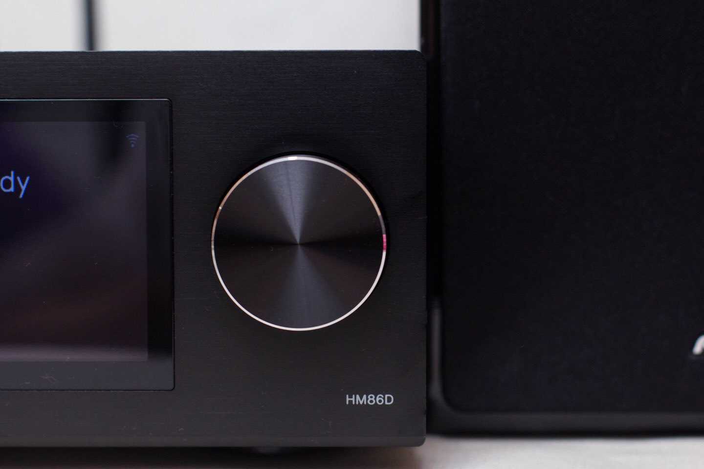 На передней панели основное внимание привлекают два элемента правой части: большой круглый регулятор громкости и находящийся рядом с ним яркий (яркость можно регулировать, опционально вовсе выключая свечение) цветной дисплей с диагональю 3,5 дюйма. На дисплей выводится различная информация о режимах работы системы, названии проигрываемой мелодии, рисунок обложки альбома и так далее