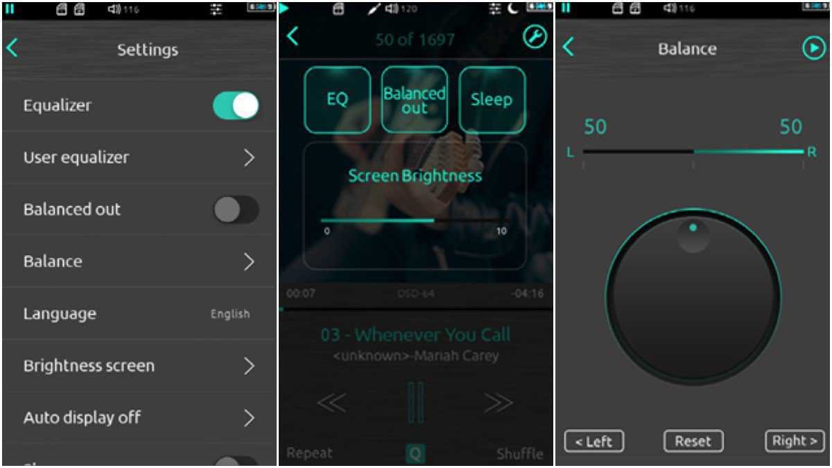 Классическая андроидная «шторка» открывает не уведомления, а кнопки быстрых настроек. Из этого меню можно ползунком отрегулировать яркость экрана, включить линейный выход, балансный выход, эквалайзер, отправить плеер в сон, а также выбрать режим воспроизведения: повтор и/или перемешивание. В правом верхнем углу, опять же стандартно для Android, находится шестеренка полноценных настроек, где можно включить режим сна, выбрать выход, отрегулировать баланс, изменить фактор усиления, а также пошаманить с эквалайзером. Эквалайзер десятиполосный, можно сохранить три пользовательских варианта и выбирать из них. Эффект чувствуется в следующую секунду.