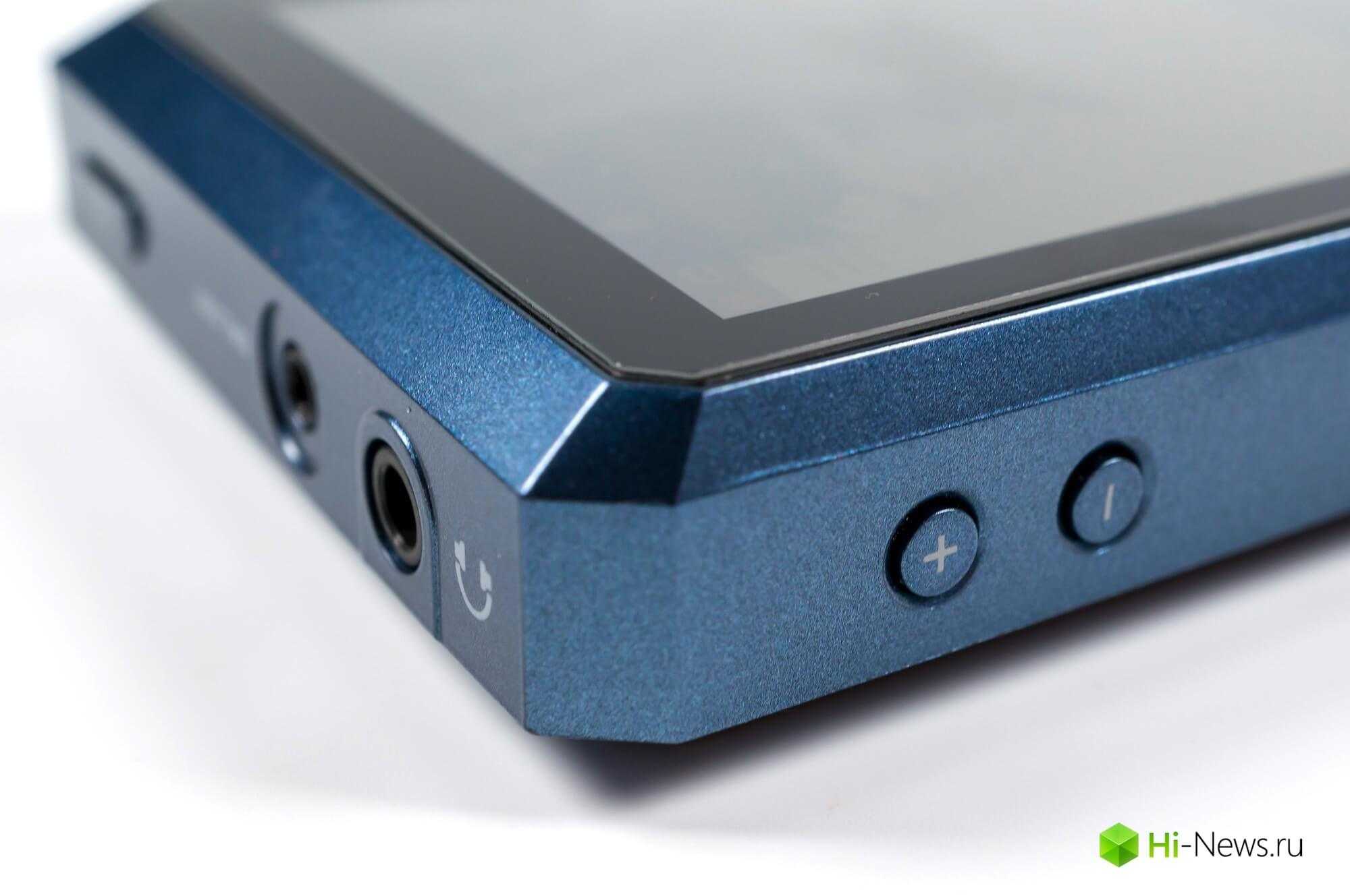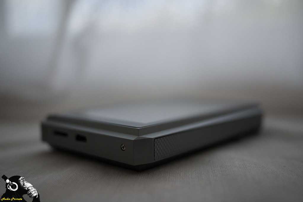 На верхнем стороне размещены выходы: 3,5 мм и 2,5 мм, около них располагается и кнопка включения/блокировки. На нижней стороне ожидаемо находится MicroUSB-разъём, служащий для зарядки плеера, доступа к памяти и функции USB ЦАПа.