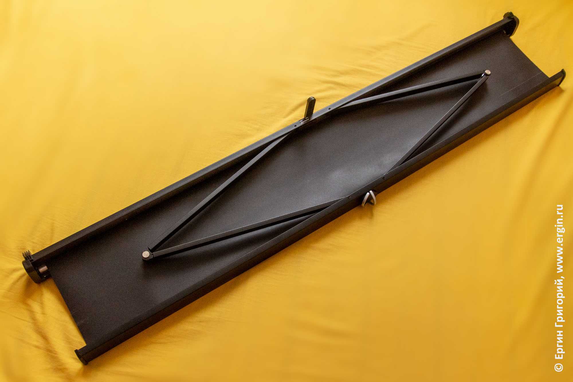 В описании LG PF50KS сказано, что размер экрана 25-100 дюймов. Да, 100 дюймов, наверное, возможно в полностью затемненном помещении. Но оптимальный экран для проектора CineBeam LG PF50KS (и для размера моей аудитории) — 50 дюймов. Я взял компактный складной настольный вариант (117 см в длину, масса 1800 г):