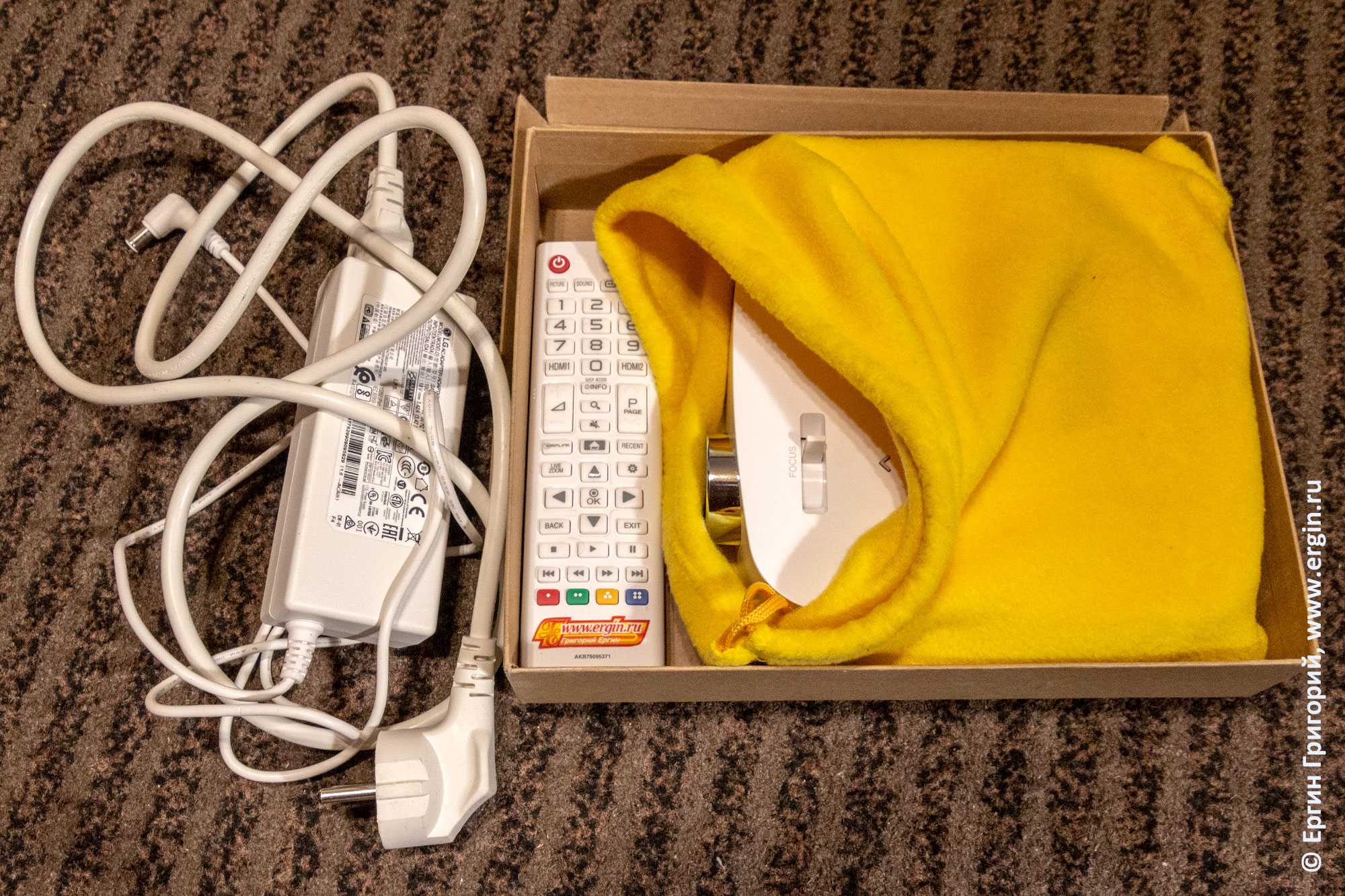 В комплекте с проектором идет горсть проводов, включая блок питания, и пульт с классическими для LG крупными цифрами. В меню настроек попасть можно как раз с помощью пульта или же джойстика, расположенного на верхней грани проектора. Настройки, однако, достаточно аскетичные: можно установить каналы, отрегулировать формат и цветопередачу экрана, подстроить регулировку трапецеидальных искажений. Трапеция регулируется в ограниченных пределах, поэтому в некоторых случаях ей приходится помогать, выкручивая ножки проектора.