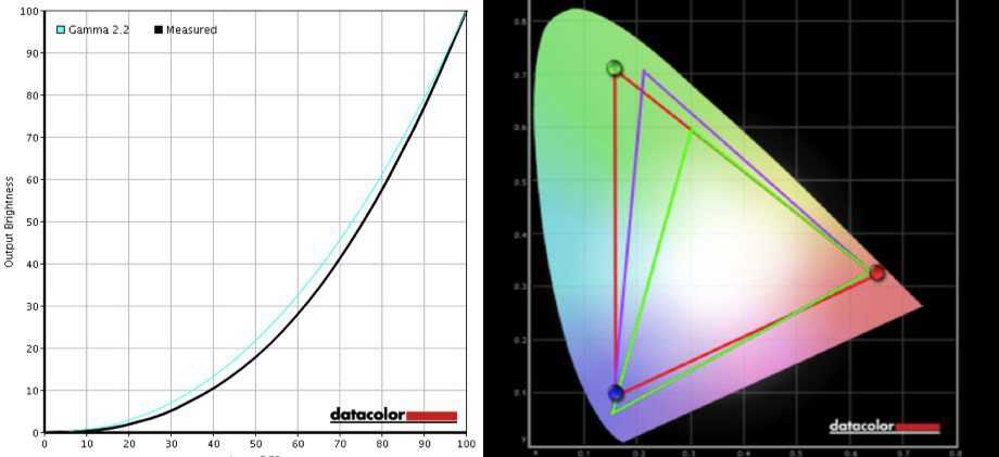 Слева: яркостный отклик в режиме «Кино». Справа: график цветового охвата CIE 1931 в режиме «Яркий»