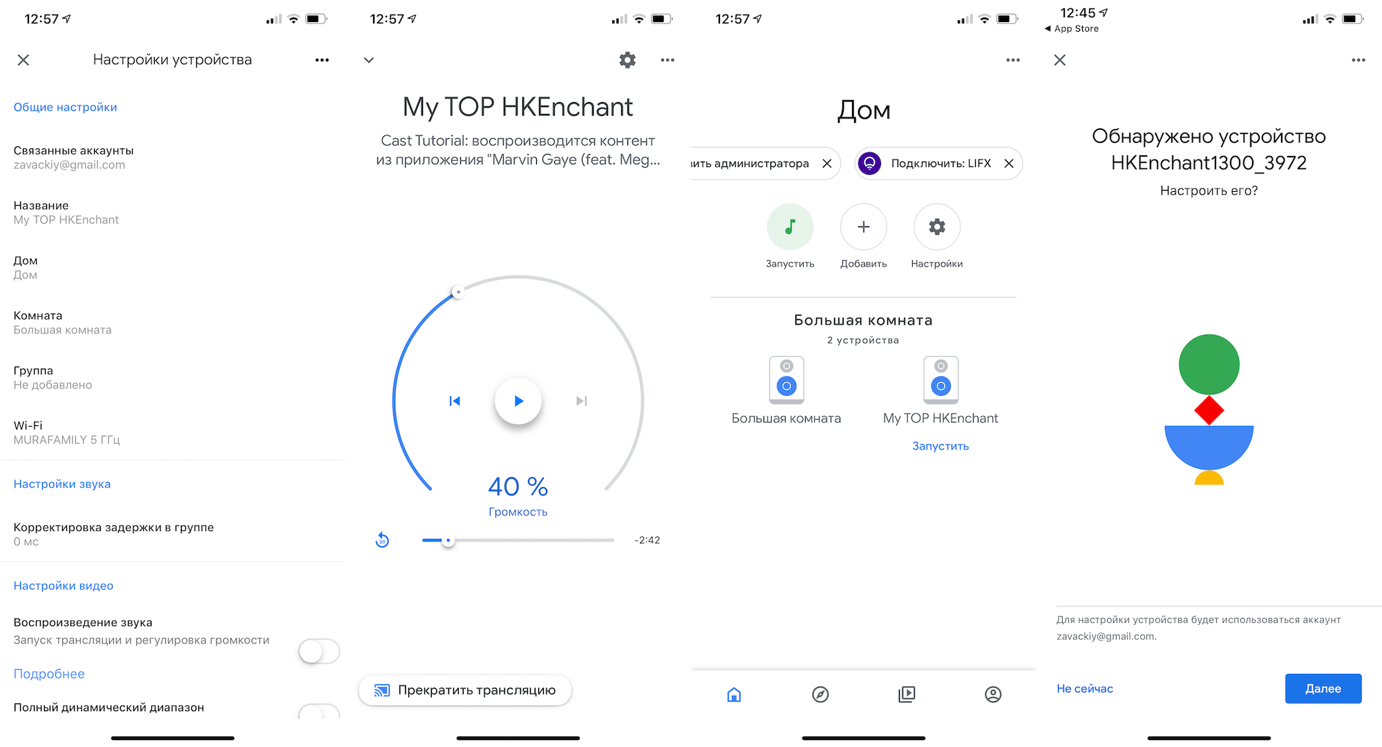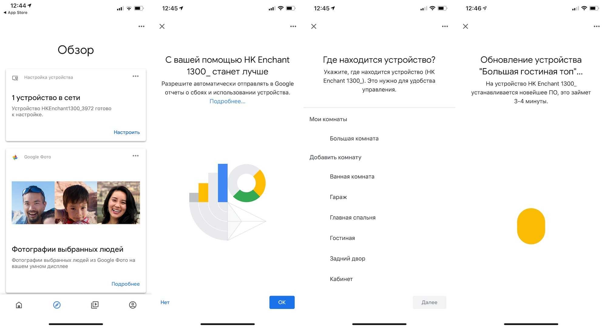 Кроме установки, подключения, первого включения и первых эмоций, вам предстоит сделать ещё кое-что. Скачайте на свой смартфон программу Google Home, пройдите регистрацию, затем вы увидите, что в квартире «светится» наш Harman Kardon. Тут же приступайте к настройке. Я удивился, как быстро всё произошло: ррраз — и вот уже система в моей сети, два — и уже качается обновление ПО для саундбара, три — можно поменять имя и настроить всякие параметры.