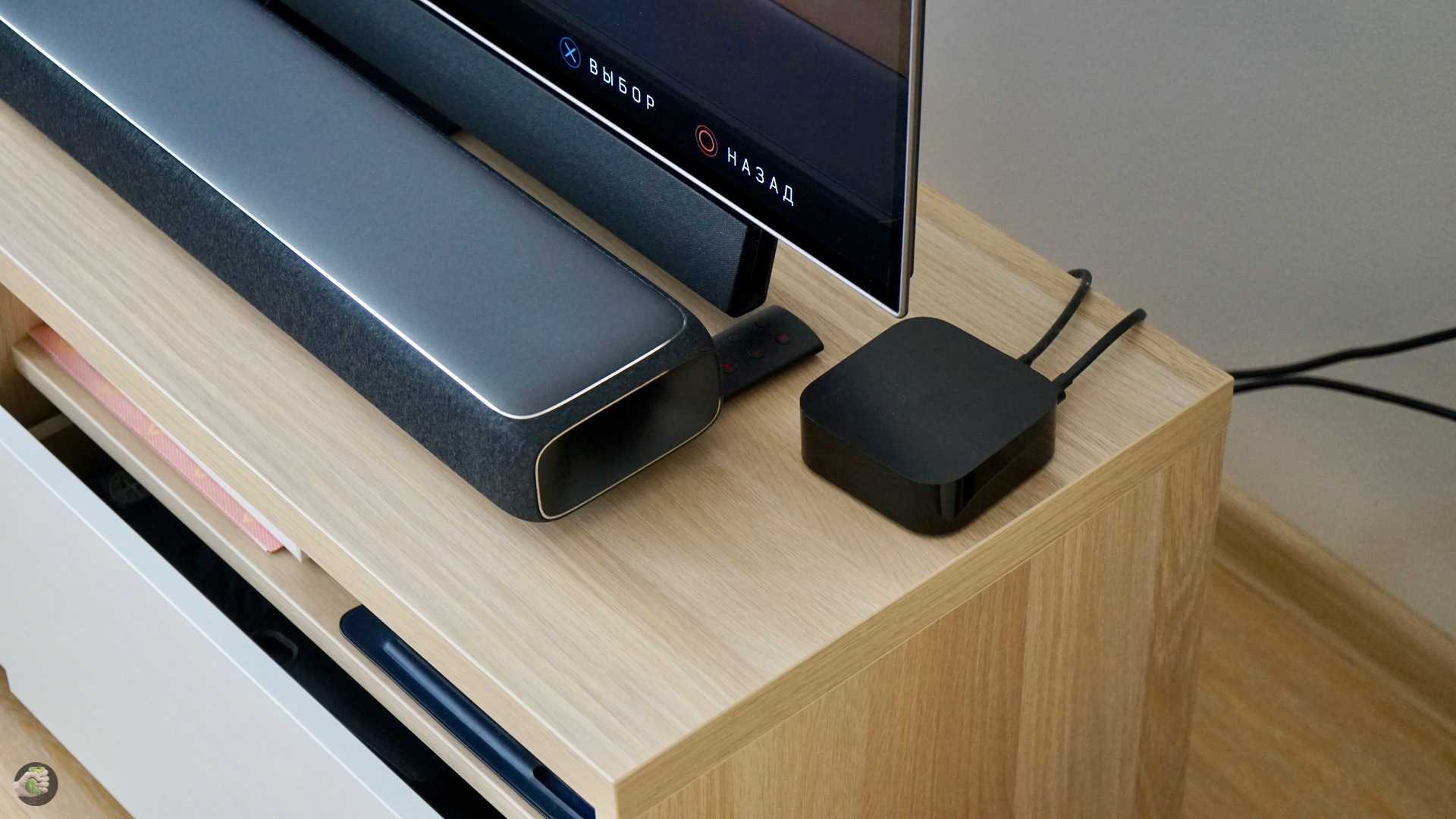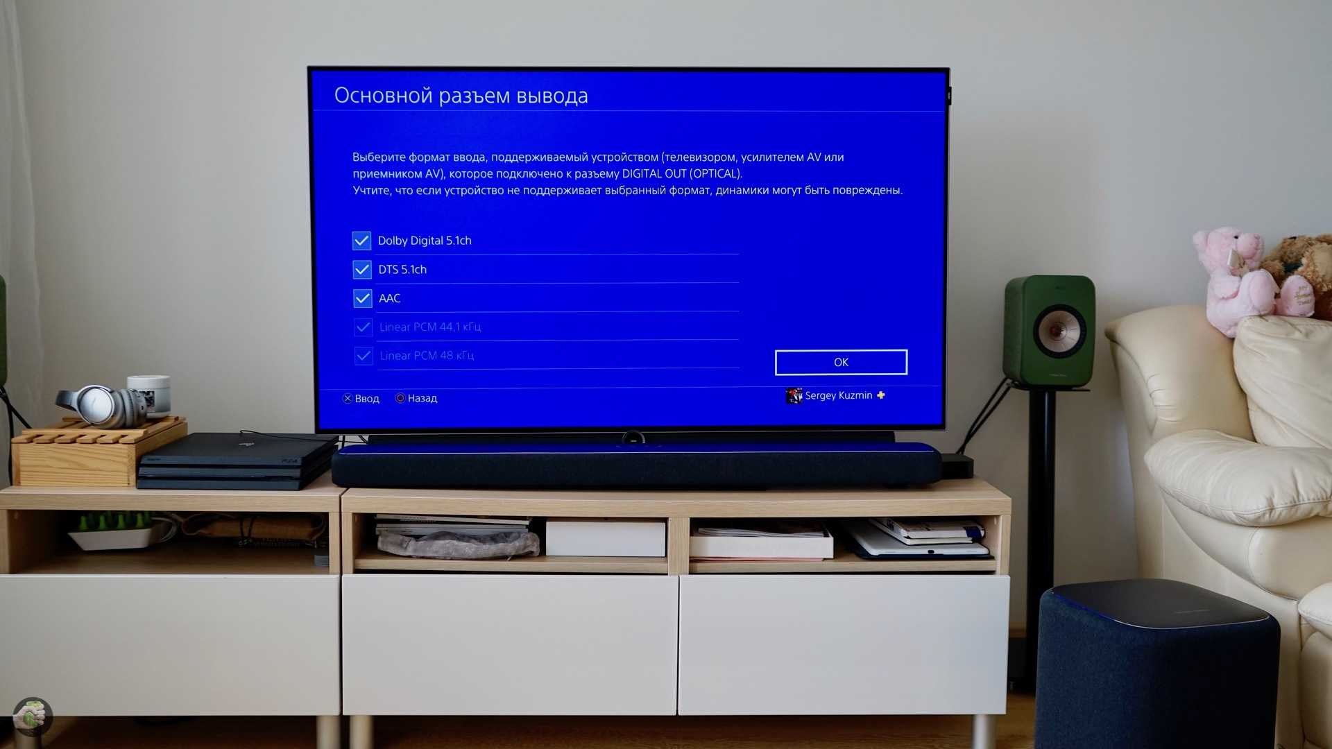 Как подключать? Выбор, конечно, за вами. В комплекте с саундбаром есть и кабель HDMI (советую купить «быстрый» кабель, например, такие есть у Belkin), и милая моему сердцу «оптика», и даже аудиокабель. Я подключил PS4 Pro с помощью волоконно-оптического кабеля, для телевизора воспользовался входом HDMI ARC, пришлось переткнуть Apple TV в другой разъём. Почему HDMI ARC? Потому что можно управлять саундбаром с пульта телевизора. Но так как на пульте Enchant 1300 есть понятные кнопки для выбора режимов, лучше всё-таки его не убирать далеко.