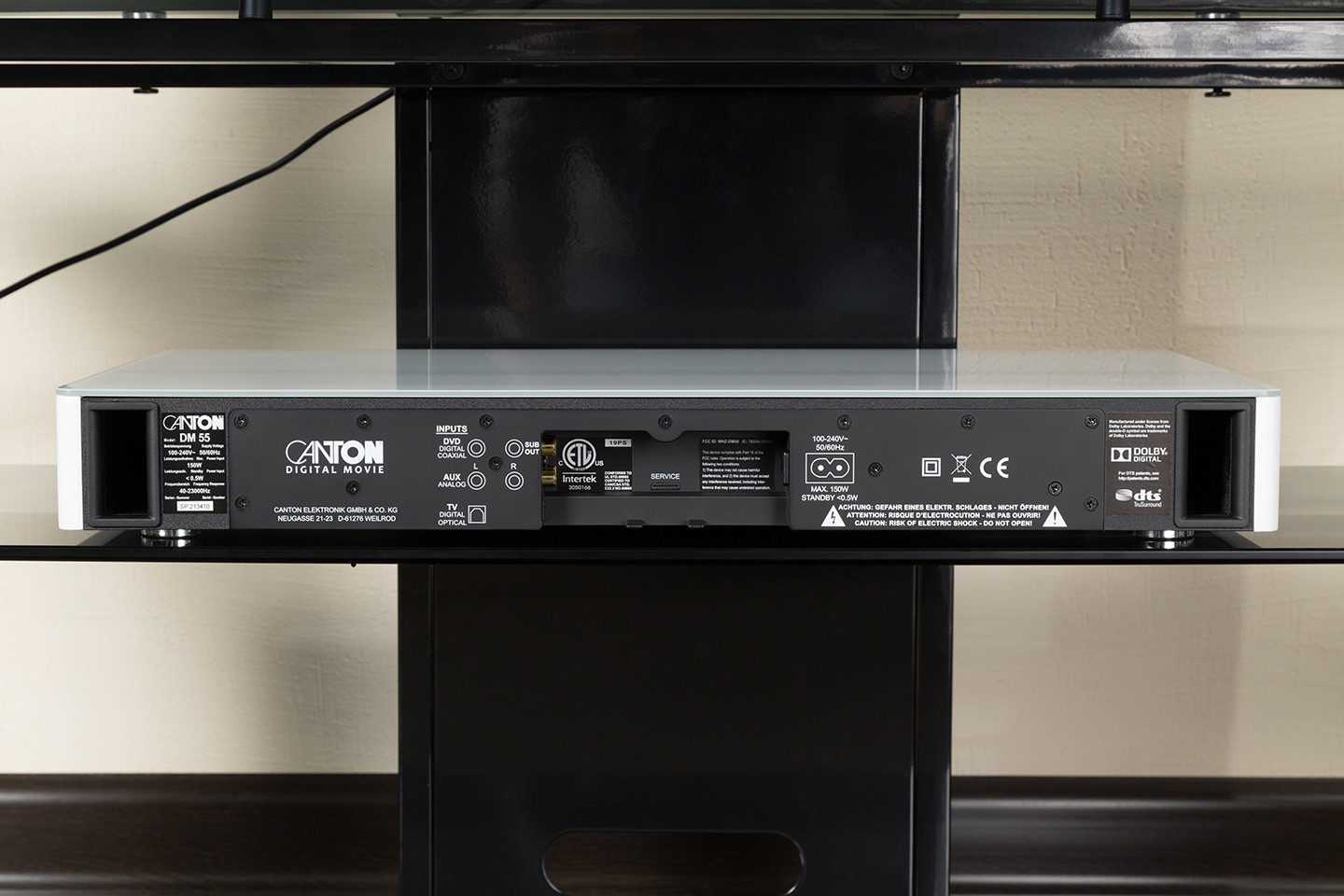 Имея в распоряжении Canton DM 90.3 или DM 55, мы водружаем аудиоустройство на тумбу, а уже сверху ставим телевизор. Конструкция корпуса аудиосистемы не просто допускает это, она на это рассчитана и без проблем выдержит любую современную панель. Визуально картина будет даже симпатичнее, чем с обычным саундбаром, ведь опоры телевизора не мешают. Вдобавок ИК-датчик окажется открытым. А если в тумбе есть специальная ниша, она будет эффективно использована на всю глубину, и сабвуфер можно не добавлять. Подобный подход вполне вписывается в ожидания рядовых покупателей бытовой аудиотехники — она должна быть максимально компактной, простой и при этом достаточно качественной. Все предпосылки к этому имеются.