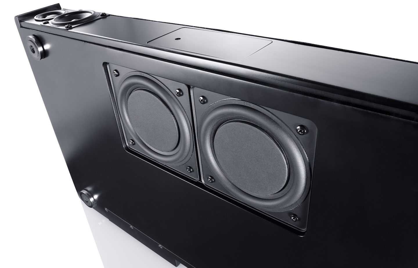 С точки зрения размещения есть свои плюсы и минусы. На стену такую конструкцию никак не пристроишь, что уже не позволит назвать данный форм-фактор потенциальным «убийцей саундбаров». Но если поставить телевизор на тумбу — ситуация меняется. Обычный саундбар мы ставим перед телевизором, и в половине случаев он полностью или частично загораживает его ИК датчик. Плюс современные дизайнерские опоры телевизоров подчас столь затейливы и широки, что не дают поставить саундбар близко к экрану. Приходится искать хитрые тумбы со специальной нишей или изобретать иные варианты установки, комбинируя тумбу и настенное крепление телевизора. Плюс сабвуфер — еще одна неотъемлемая часть системы.