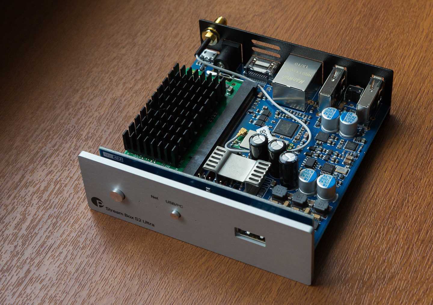 Если более конкретно, то Stream Box S2 Ultra построен на базе небезызвестной одноплатной системы Raspberry Pi. Но только не подумайте, что инженеры Pro-Ject просто взяли универсальную платформу, упаковали ее в презентабельную металлическую коробочку, написали софтовый плеер и выставили в продажу по совсем даже не пустячной цене. Материнская плата здесь полностью оригинальной разработки, а вычислительный модуль Raspberry Pi на базе 4-ядерного ARM-процессора Broadcom просто установлен на ее внутреннем разъеме.