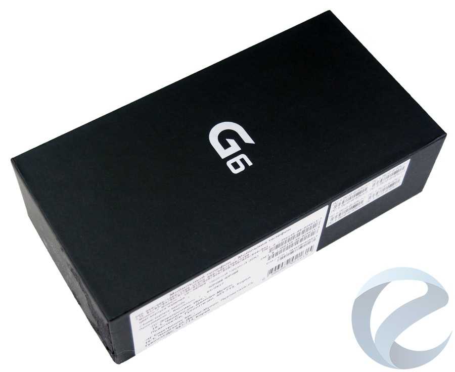 LG G6 на рынке РФ представлен в трех цветах: черный, белый и платина. При этом упаковка для всех расцветок единая. Как и подобает статусности девайса, G6 поставляется в по-настоящему премиальной упаковке. Черный толстый картон с матовым покрытием подчеркивает особенность находящегося внутри смартфона. На верхней грани коробки расположено название смартфона, а на тыльной стороне упаковки — некоторые товарные знаки и производитель используемого в G6 процессора.