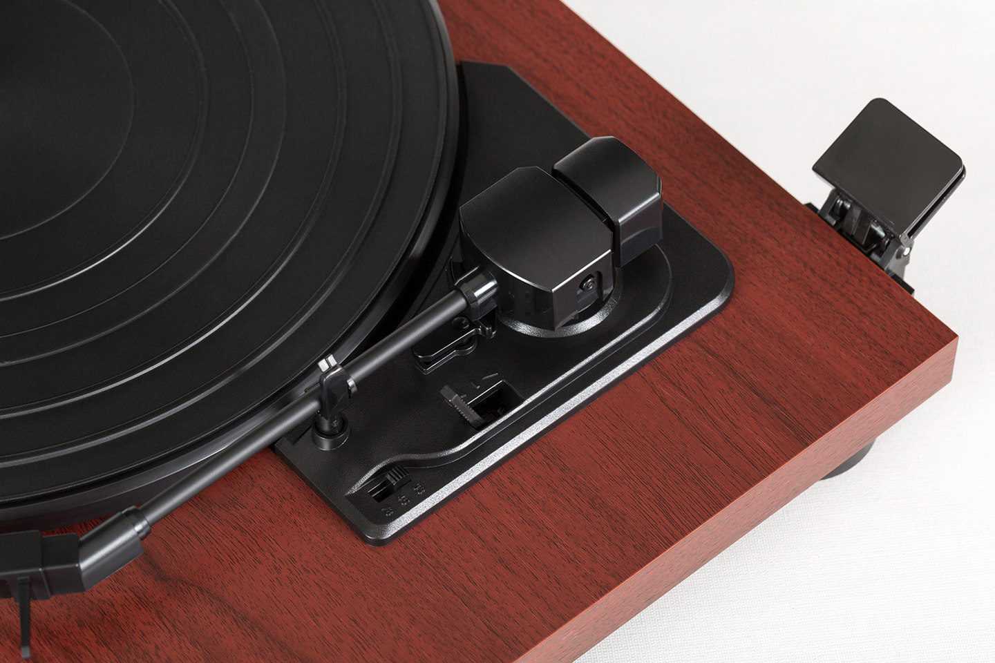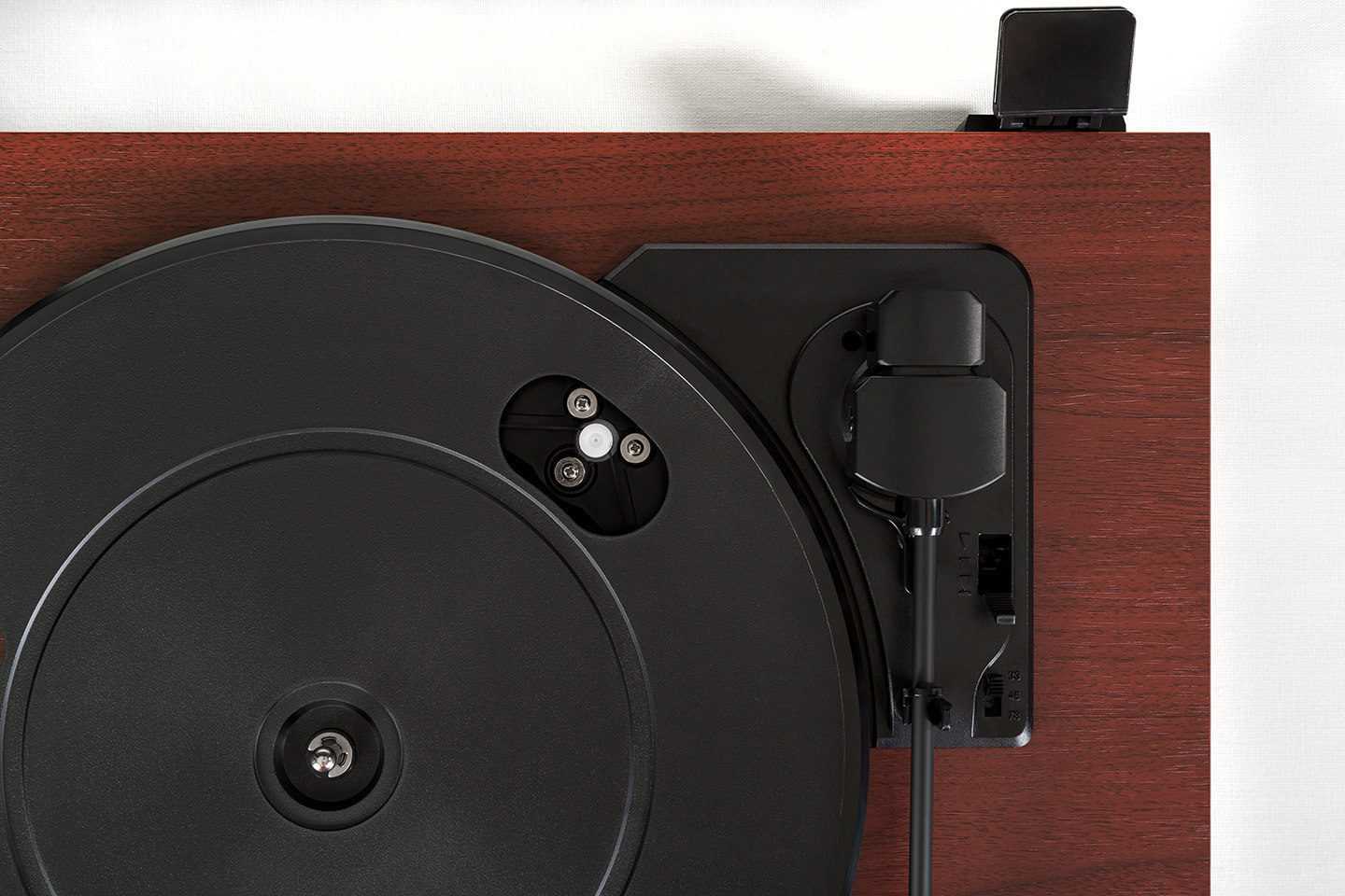 Рядом с базой тонарма находятся рычажок для его подъема и переключатель скоростей