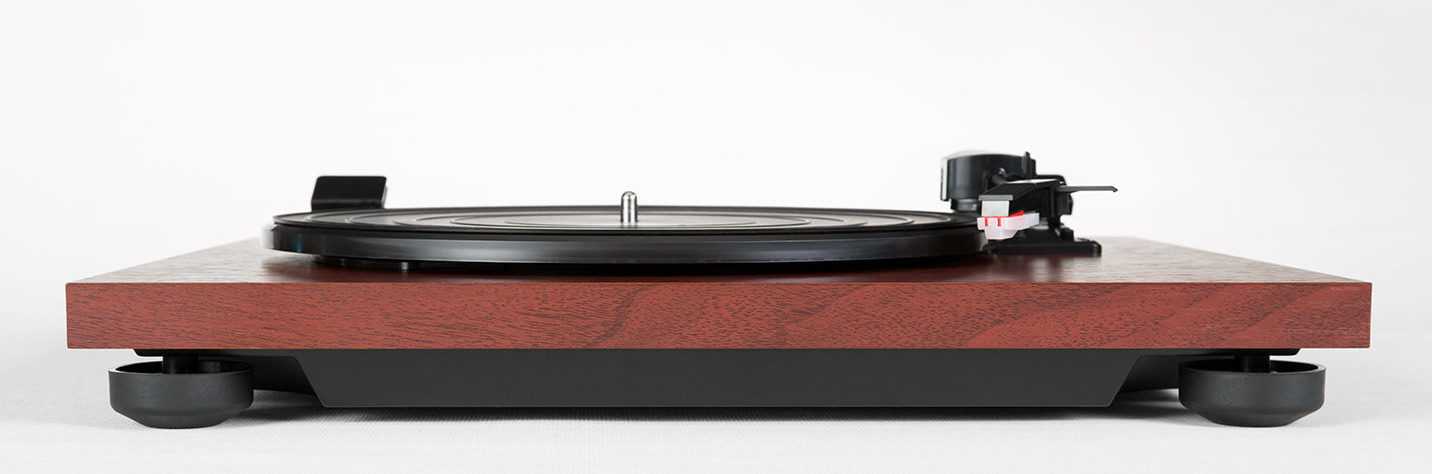 Сам же проигрыватель выглядит более чем прилично, и я бы сказал выше своей цены. Корпус выполнен из МДФ, отделка — «вишня», и она придает образу вертушки тот самый винтажный дух, который часто ищут новообращенные поклонники винила. Корпус покоится на четырех прорезиненных ножках, призванных служить виброизолятором. И про сам корпус фирма пишет, что он тяжелый и хорошо демпфирует проигрыватель.