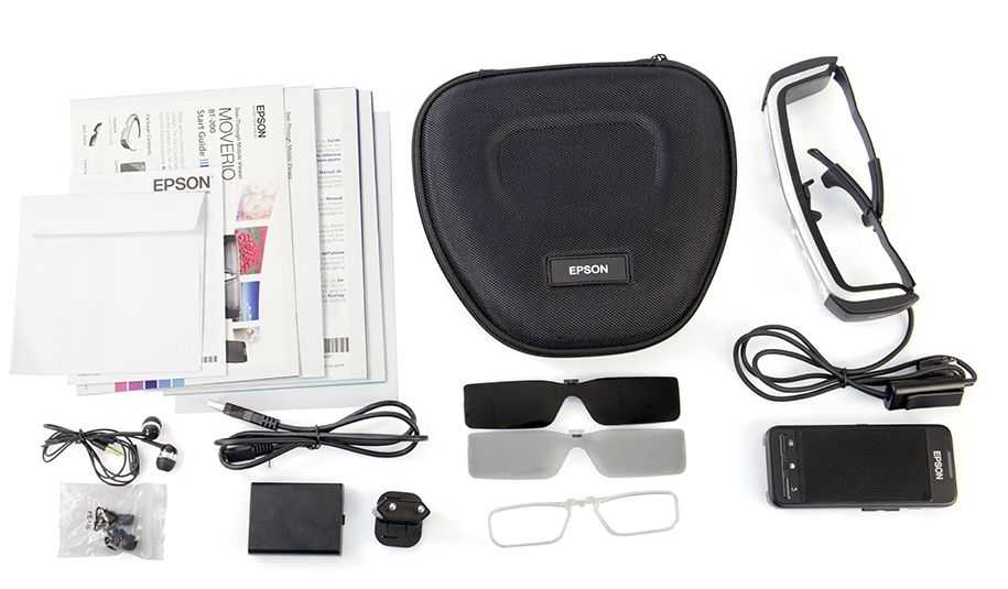 В комплекте с очками Epson Moverio BT-200 идут два затемняющих фильтра и пластиковая оправа, в которую можно поставить стекла с диоптриями (замена обычных очков)