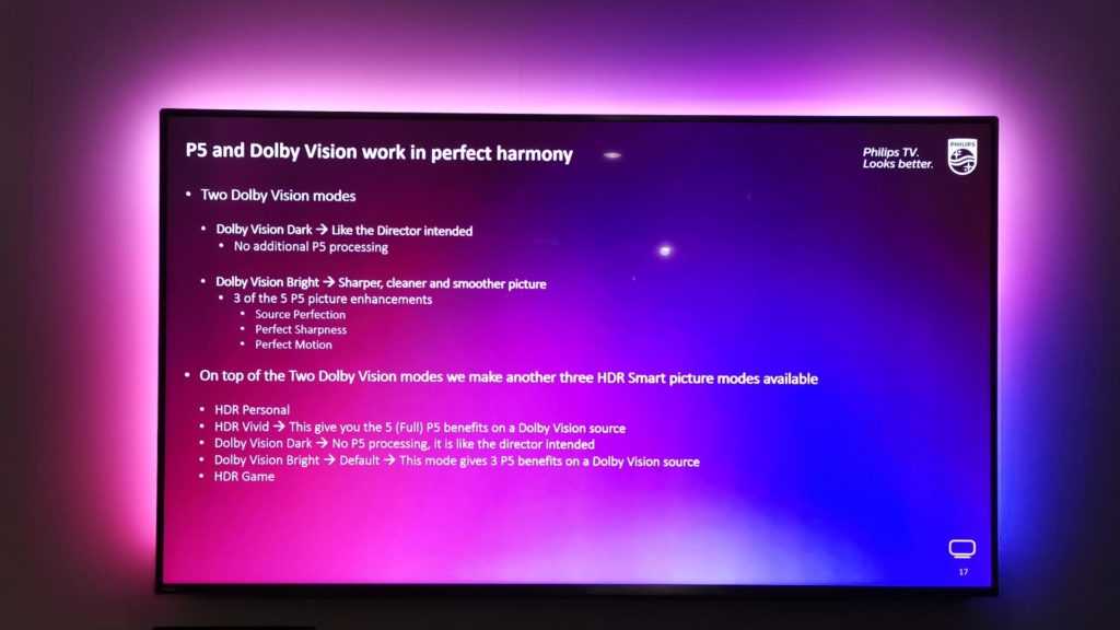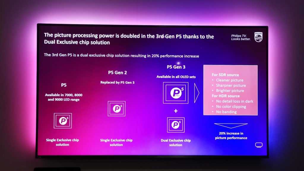 Dále jsou zde (už mimo Dolby Vision) nové režimy HDR Vivid a HDR Game. Všechny modely až do řady 6000 navíc podporují hlavní standardy HDR, v tomto je Philips vcelku unikátní. Původní čip P5 bude nyní v řadách 7000, 8000 a 9000 (všehno LCD), novinka bude pohánět všechny nové OLEDy.