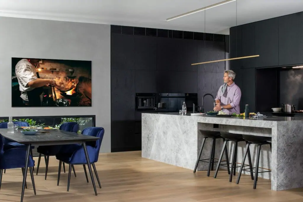 В этой модели производитель также использовал интеллектуальные функции улучшения изображения. Благодаря им яркость, контрастность и насыщенность всегда будут оставаться на максимально возможном уровне. Также стоит оценить простой дизайн каркаса и ножек, который хорошо впишется в декор любой гостиной. Когда телевизор Samsung 8K QLED висит на стене, он выглядит как картинка.