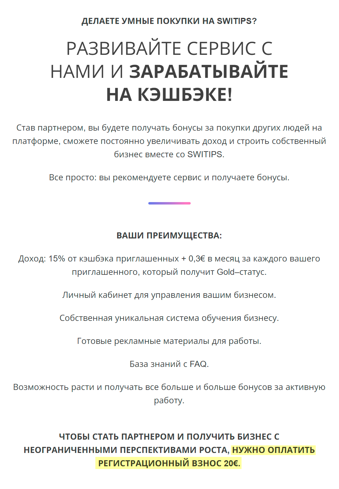 Но Switips также рекламирует услугу, которую называет партнерской программой, — и к ней уже появляются вопросы.