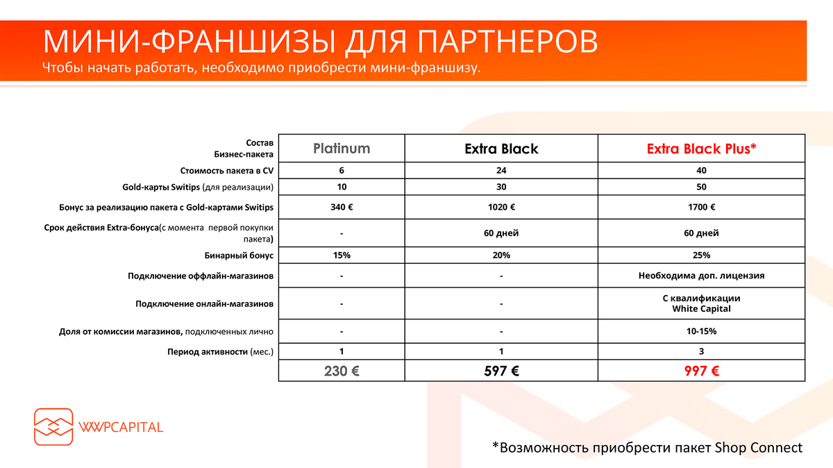 Зато в процессе поисков я нашел ссылку на презентацию WWP Capital, где партнерская программа расписывается гораздо подробнее. Судя по этому документу, приглашение новых клиентов — только небольшой кусочек разветвленной сети. Для участия в других программах просят уже больше денег: я нашел пакеты за 230, 597 и 997 €. Неудача в таких начинаниях будет стоить гораздо больше недополученного кэшбэка или 20 € взноса.
