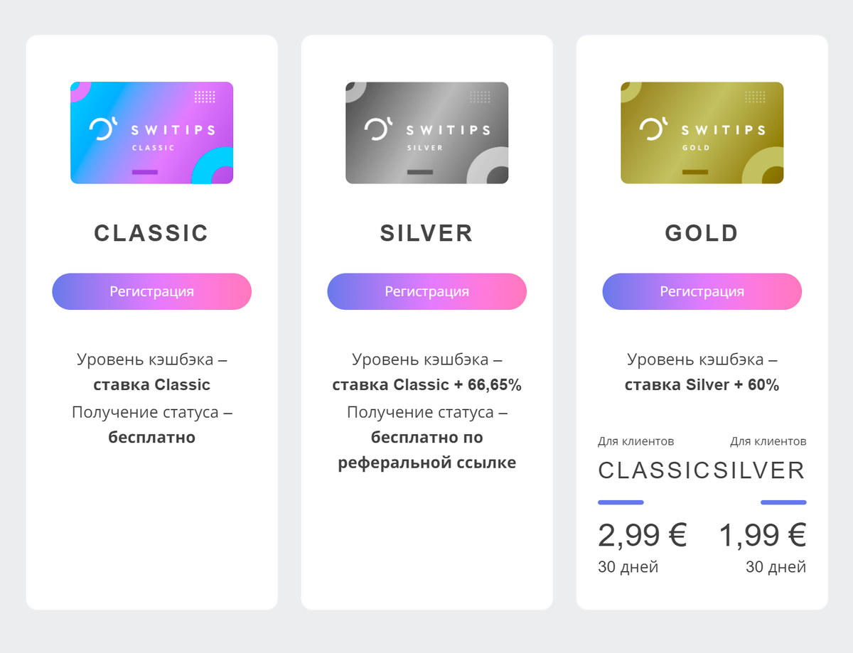 На своем сайте Switips предлагает получать кэшбэк за покупки. Он прописан в карточках товаров и услуг и начинается от 0,3%. Размер кэшбэка зависит от тарифа. Базовая ставка для всех — на тарифе Classic. Чтобы получать больше кэшбэка, можно перейти на Silver и Gold, но они доступны только при соблюдении определенных условий.