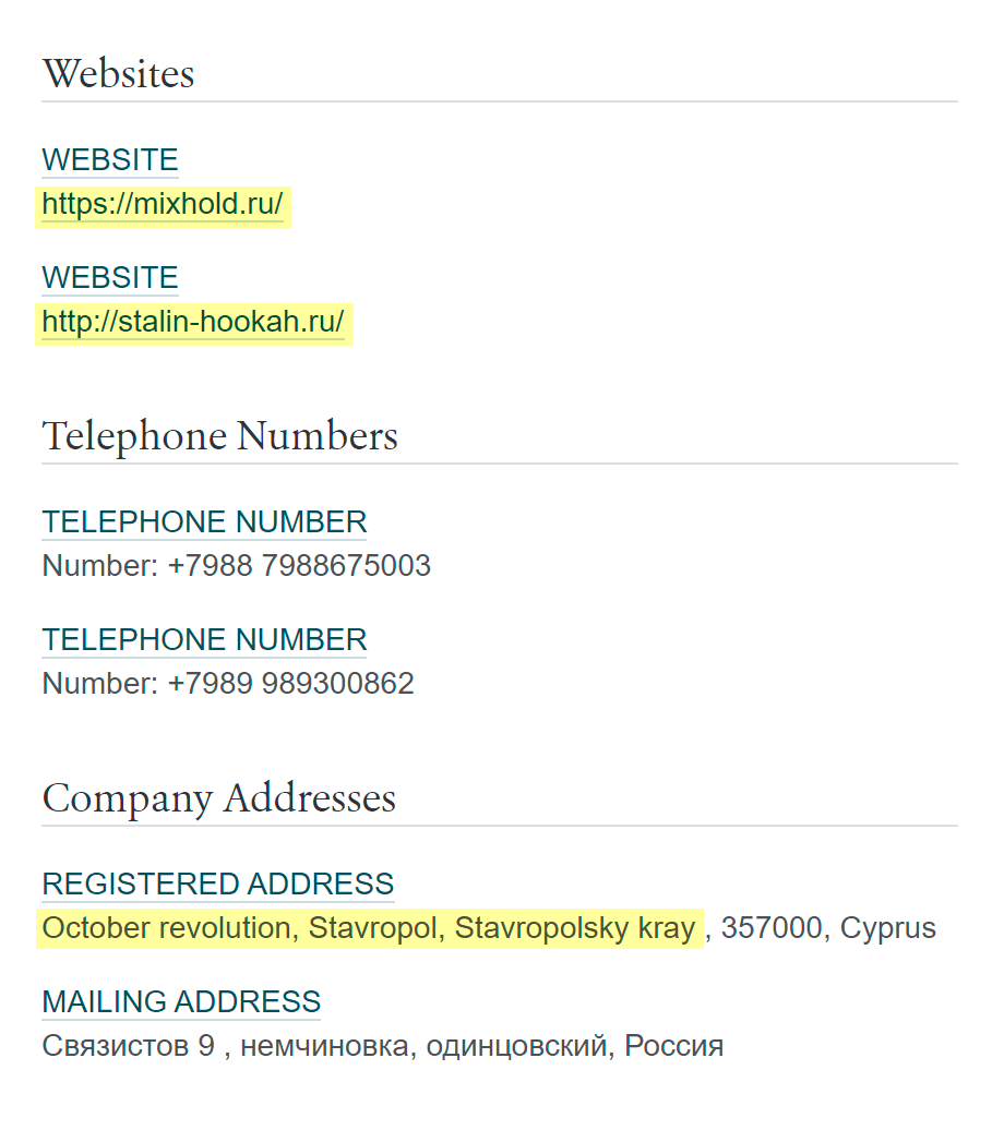 При кипрской регистрации у компании почему-то указан российский адрес и сайты на российских доменах