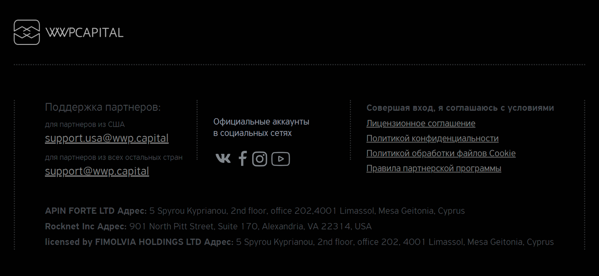 В момент оплаты пакета Gold пользователя переводят на сайт WWP Capital — это еще одно подтверждение того, что проекты связаны. Но WWP Capital называет своим юрлицом другую компанию — Apin Forte Ltd., тоже зарегистрированную на Кипре. Впрочем, и компания Fimolvia Holdings здесь упоминается — как лицензиар проекта.