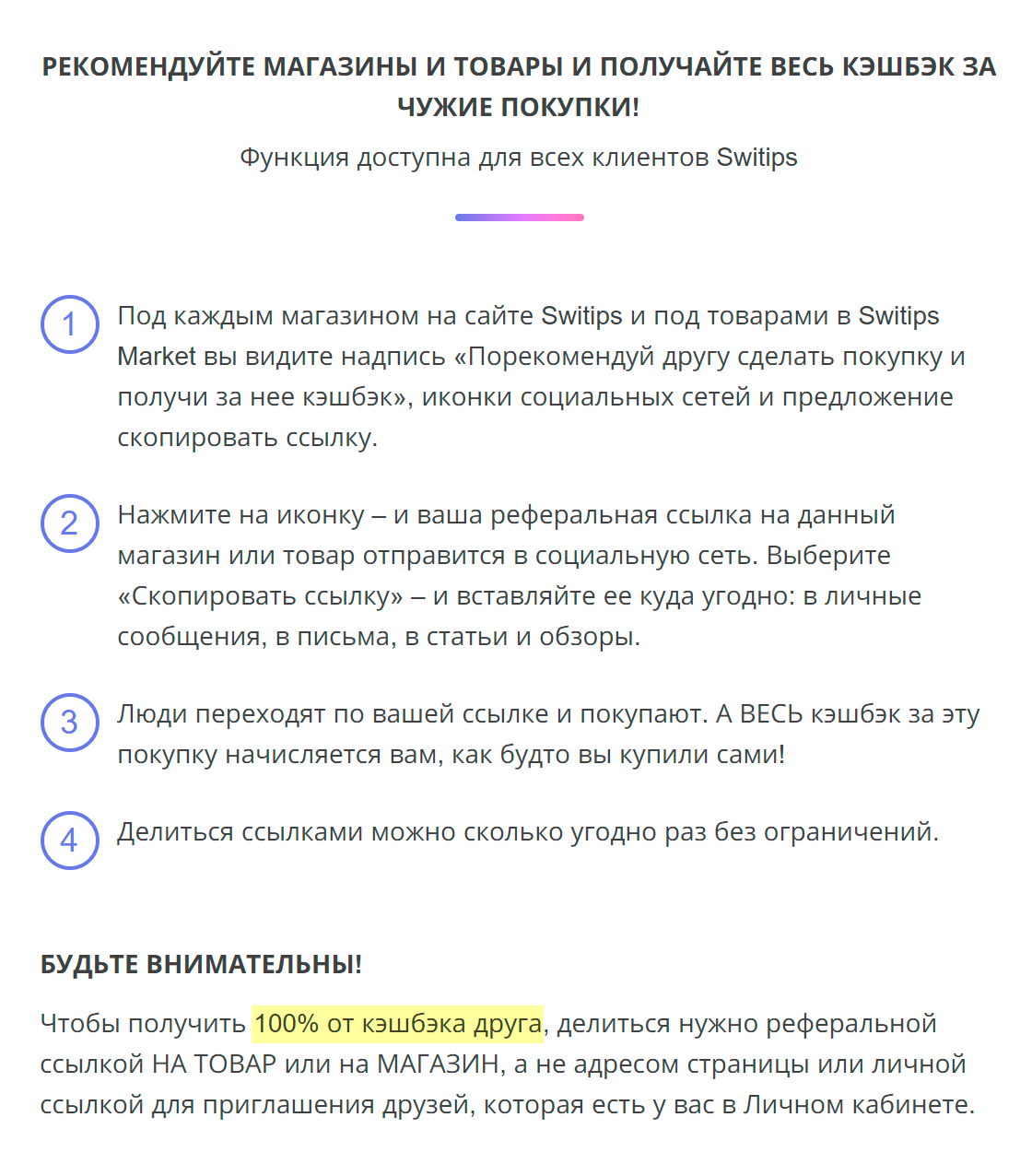 У проекта есть реферальная программа вида «пригласи друга»: если друг совершит покупку в магазине, где подключен кэшбэк Switips, сервис обещает заплатить вам столько же, сколько и другу. Это все еще не вызывает подозрений, потому что принять участие в программе может любой клиент сервиса, а вознаграждение возникает только при покупке — понятно, откуда берутся деньги.