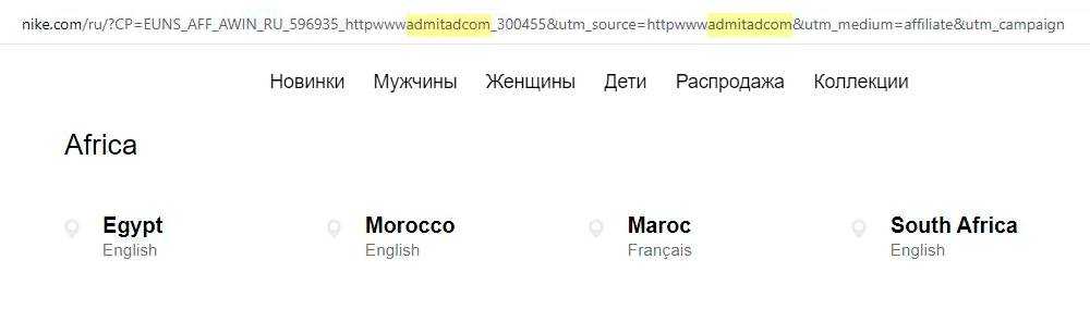 При переходе на сайт «Найка» с сайта Switips я обнаружил в адресной строке элементы партнерской ссылки Admitad. Это говорит о том, что сервис работает еще через одного посредника