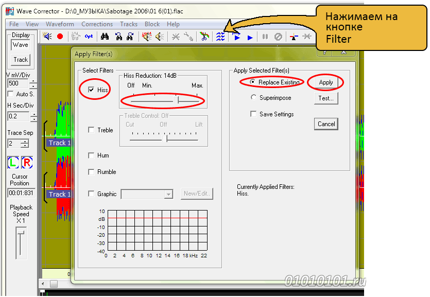 Если на слух всё устраивает, кликаем кнопку ОК. В противном случае жмём на кнопку Create New (Создать новый образец) и «тыкаем» курсором в то место, которое, как мы считаем, более подходит для взятия образца. Опять прослушиваем и жмём ОК. После того как изменения сделаны, фильтр для удаления шума надо применить заново. На панели инструментов кликаем кнопку Filter, в открывшемся диалоговом окне ставим флажок Hiss (Шум), слайдер уровня шумопонижения оставляем без изменений, выбираем режим замены (Replace Existing) и жмём кнопку Apply (Применить):