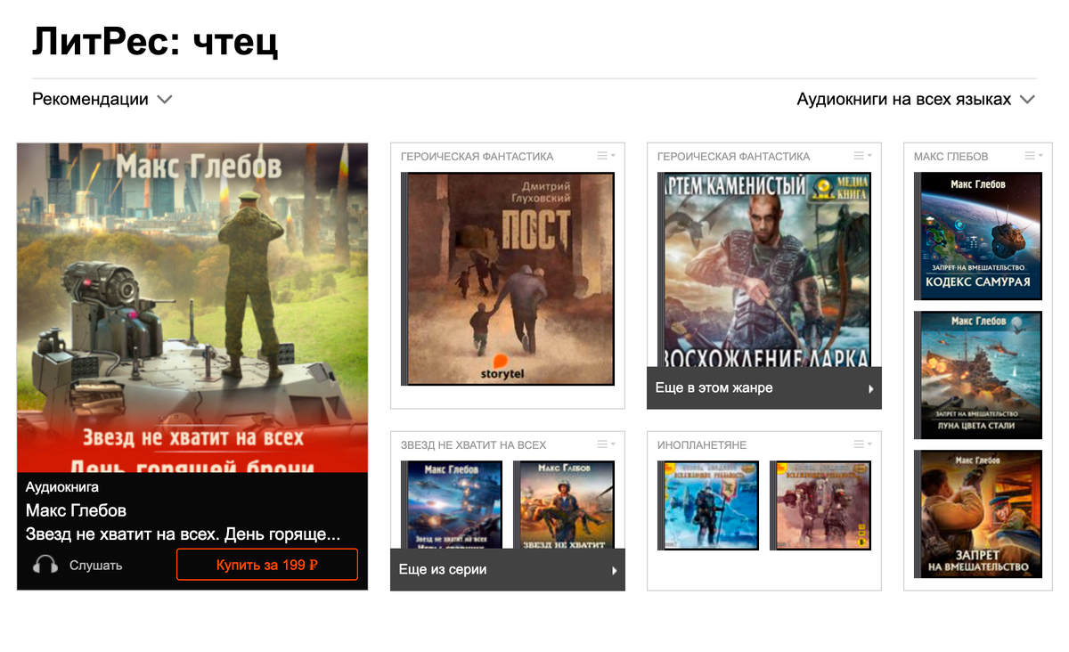 На сайте «Литрес» есть проект «Чтец». Там собраны книги, озвученные любителями, — в основном это фантастика или эротика