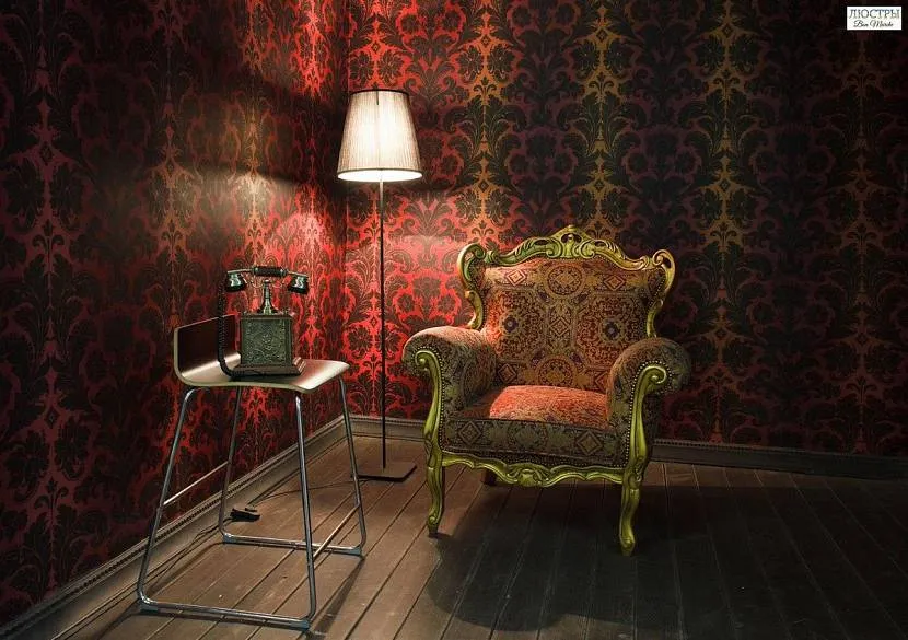 Гостиная в эклектике – классический торшер, кресло барокко, ретро-телефонИсточник Twitter