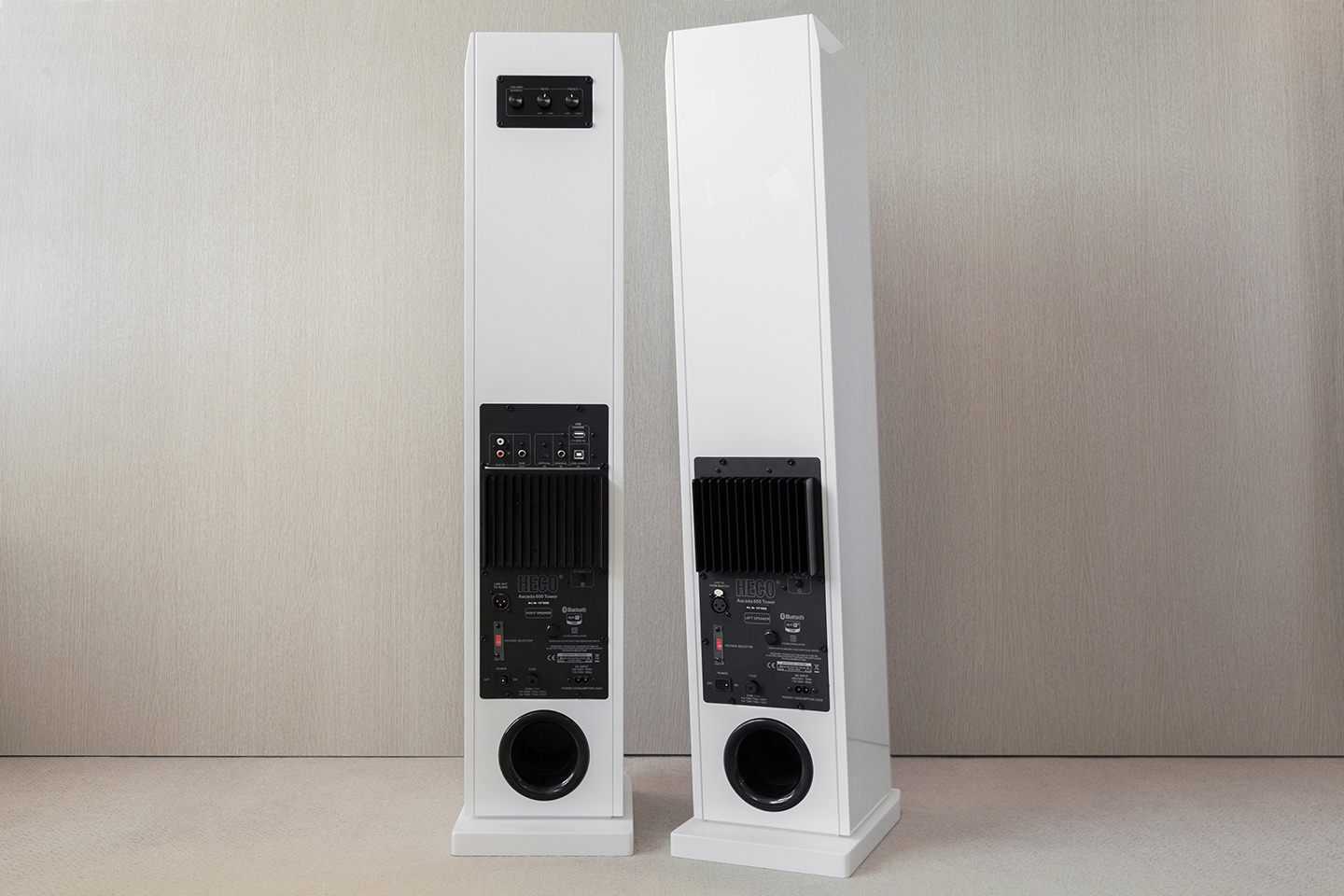 Панель подключения, регуляторы громкости и тембров находятся на задней панели правой колонки. Набор входов наиболее широк и универсален: это единственная акустика имеющая аналоговый, оптический, коаксиальный входы, да еще и USB-B одновременно. Имеется у Heco Ascada 600 Tower сабвуферный выход и еще один порт USB для зарядки портативных устройств с выходным током 2,1 А.