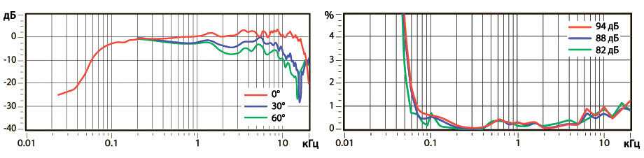 Модель может похвастать очень ровной АЧХ. Направленность довольно широкая и ровная (по горизонтали). По графику видно, что лучший частотный баланс наблюдается на углах прослушивания между 0 и 30°. Спуск в НЧ-область плавный, но ранний — уже с 200 Гц. Нижняя частотная граница располагается в районе 60 Гц, что очень неплохо для компактных акустических систем. Уровень КНИ не претендует на профессионально низкое значение и все же остается ниже 1% практически на всей рабочей области колонок. Чуть более чисто бас воспроизводится на малой громкости, где вполне доступны те же 60 Гц при КНИ меньше 1%. Но на большее рассчитывать не приходится, ниже 60 Гц уровень искажений начинает резко расти.