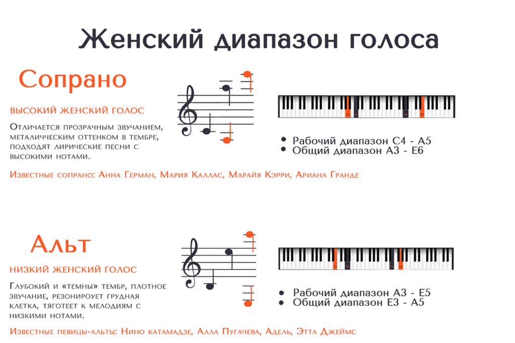 От мужских женские виды певческих голосов отличает сила, легкость, прозрачность и насыщенность звука.