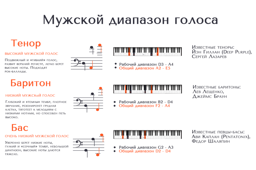 Для вокалистов важно знать свой диапазон – количество нот, которые он способен охватить в верхней и нижней тесситуре. Определить свой вокальный диапазон можно, пропевая гаммы: начиная с самой нижней ноты и дойдя до верхней, которую человек может спеть, не переходя в хрипы и свист