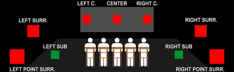 Он имеет шесть каналов, включая пять основных динамиков и сабвуфер. Спереди расположены три динамика: слева, в центре и справа, а также два динамика объемного звука в задней части комнаты – один слева и один справа.