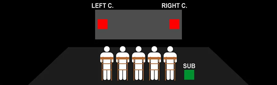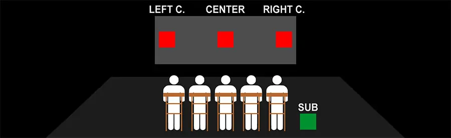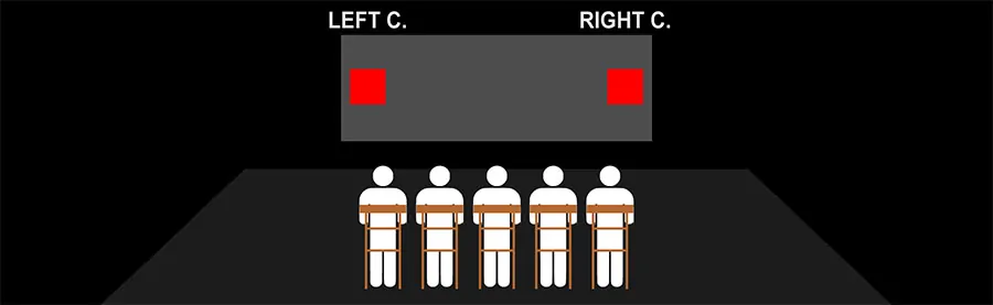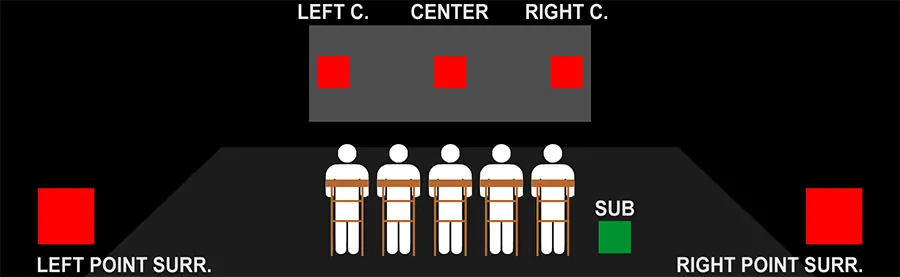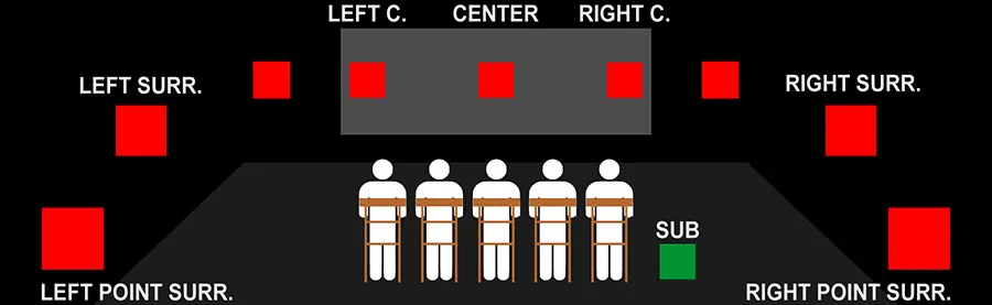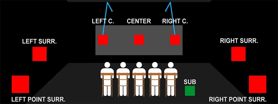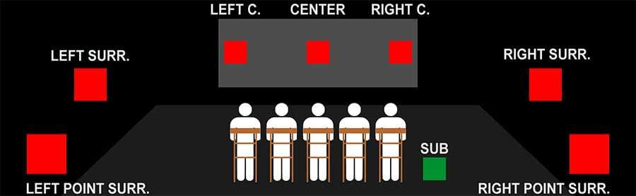 Расположение динамиков для исходных шести каналов системы объемного звучания 5.1, но в идеале два задних динамика должны быть расположены под углом от 135 до 150 градусов от центрального канала / телевизора для оптимального объемного звучания.