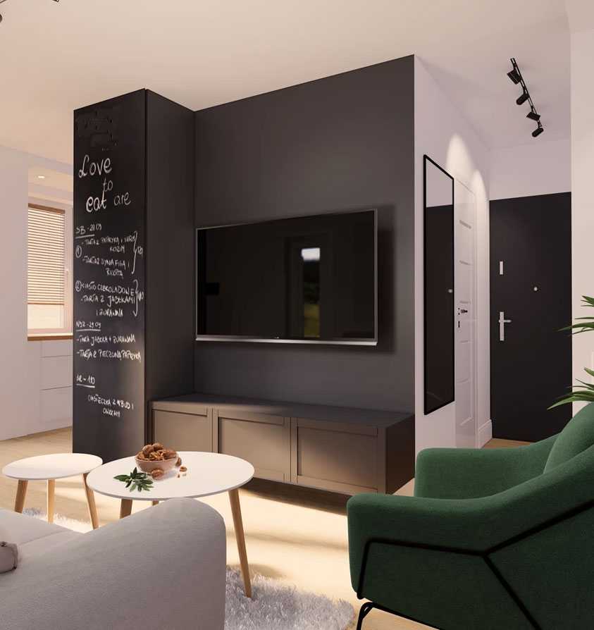 Поскольку гостиная небольшая, стены покрашены в белый цвет, одна стена оформлена геометрическими обоями, на другой расположились 2 плаката в тоненьких, черных, контрастных рамках. Черная грифельная стена оттеняет светлые тона. Черный цвет также присутствует на маленьких интерьерных элементах – ручке двери, ножках кресла, аккуратном потолочном светильнике-рефлекторе. Мебель подобрана в красивом, глубоком, зеленом цвете.