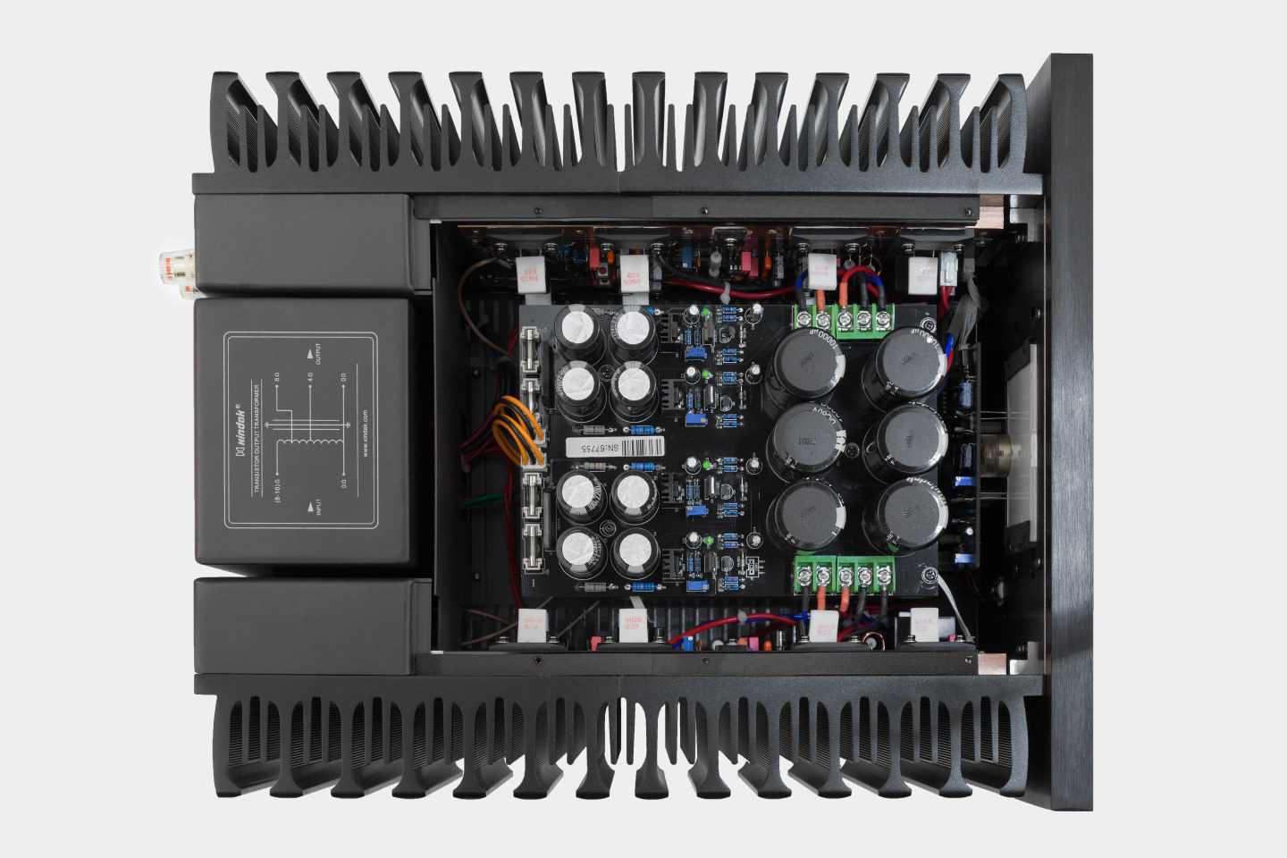 Внутренности моноблоков можно посмотреть на фото, ничего экстраординарного или предосудительного я не нашел: добротная сборка, приличные детали. В конструкции есть выходные трансформаторы внушительных размеров — явно инженеры поставили их не просто так, ведь могли обойтись и без них. У аппаратов заявлена полностью балансная схема.