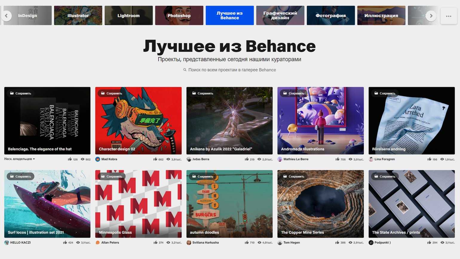 Так как на Behance каждый может публиковать свои проекты, поначалу бывает сложно отличить хорошую работу от плохой. Чтобы тренировать насмотренность на основе качественных работ, можно опираться на мнение кураторов, которые ведут тематические галереи на Behance.