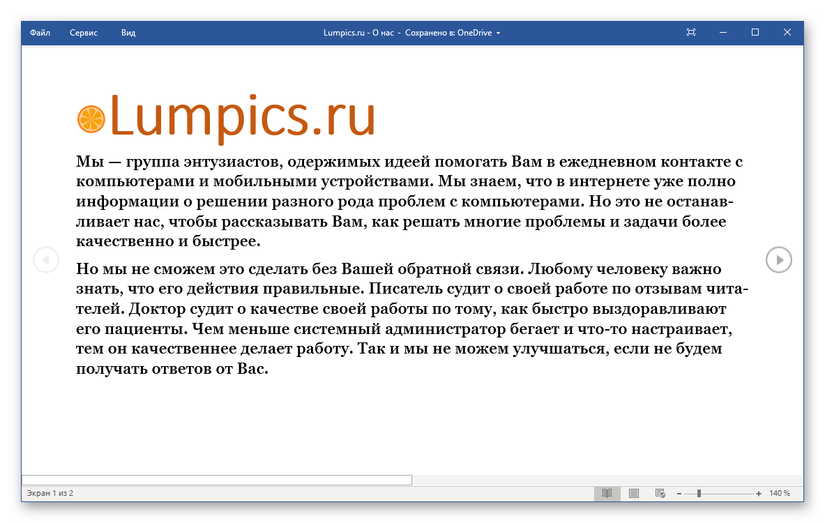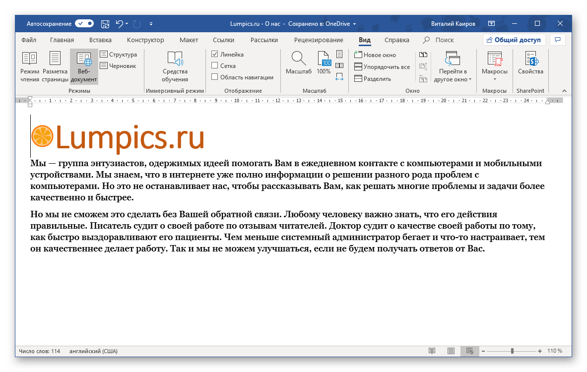 По умолчанию, и чаще всего этот параметр не меняется пользователем, работа с документом Word осуществляется в «Режиме разметки». Это стандартное для программы представление, и если включить в нем «Линейку», она появится как в горизонтальной, так и в вертикальной плоскости. Во всех остальных режимах отображения будет показана либо только горизонтальная линейка, либо она будет отсутствовать вовсе. Наглядный пример: