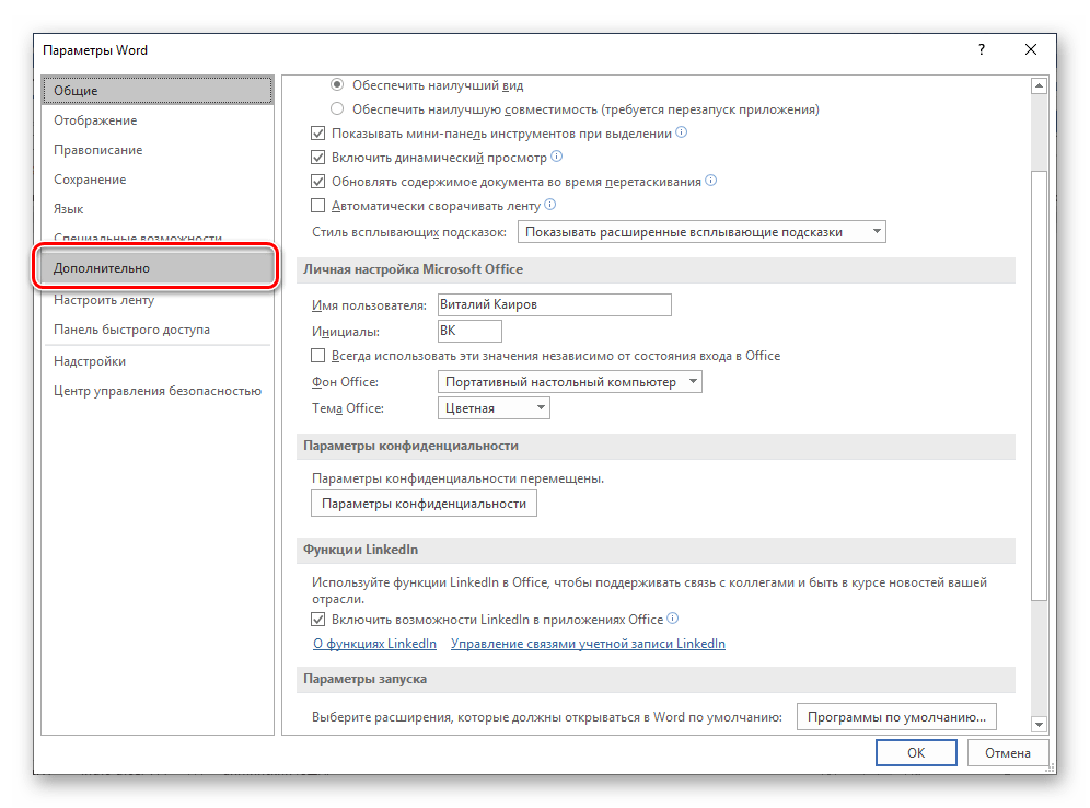 В отобразившемся диалоговом окне перейдите во вкладку «Дополнительно».