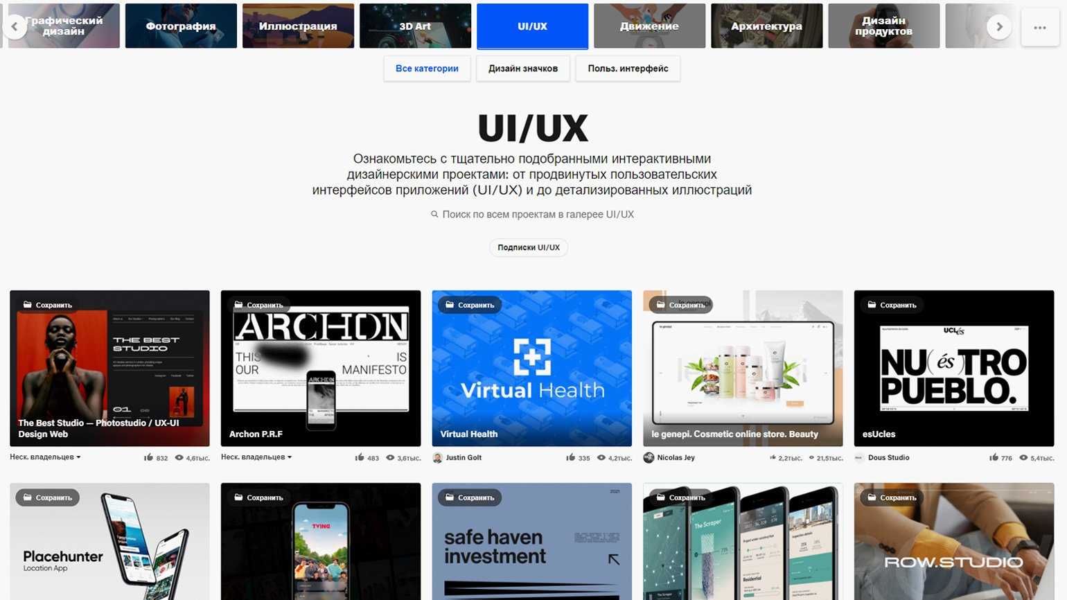 Это основная галерея из темы пользовательских интерфейсов, где можно найти лучшие кейсы дизайна сайтов и приложений, а также иллюстрации.
