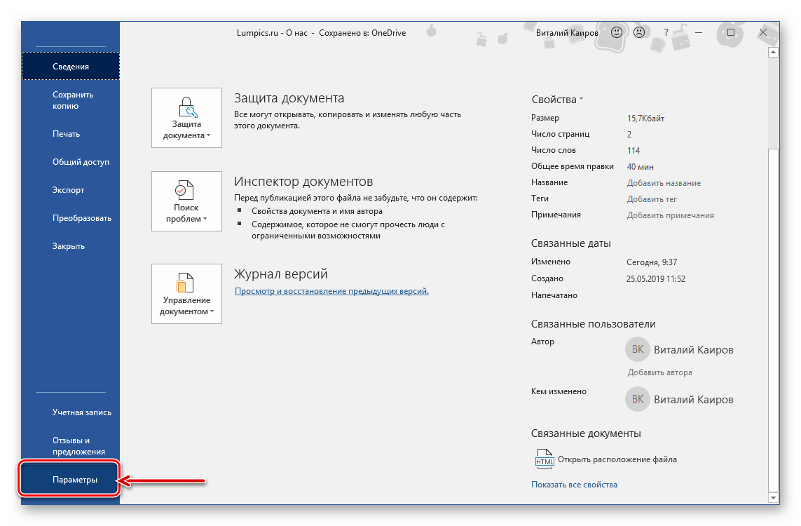- Откройте меню «Файл» и перейдите к разделу «Параметры» (расположен в самом низу боковой панели. В старых версиях Word для этого необходимо нажать по расположенному в левом верхнем углу логотипу MS Office, а затем, когда будет открыто меню, по кнопке «Параметры Word».