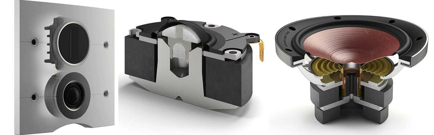 За верхний диапазон в Callisto отвечает гибридная сборка — твитер с 30-миллиметровым мягким куполом и пленочный изостатический излучатель размером 17 х 45 мм, который размещается выше в круглом проеме под мелкоячеистой пылезащитной сеткой. За середину и бас – фирменные головки с 17-сантиметровыми диффузорами из легкой длинноволокнистой целлюлозы (по одной в каждом полочном мониторе, и по паре в моделях 6 C). Эти динамики примечательны также магнитами, спекаемыми из особой смеси Soft Magnetic Compound. Технология SMC, которая позволяет получить в магнитах повышенное электрическое сопротивление без ослабления магнитной проницаемости, уже давно применяется в самых продвинутых моделях DALI – она минимизирует искажения за счет редукции вихревых токов, протекающих в магнитном приводе.