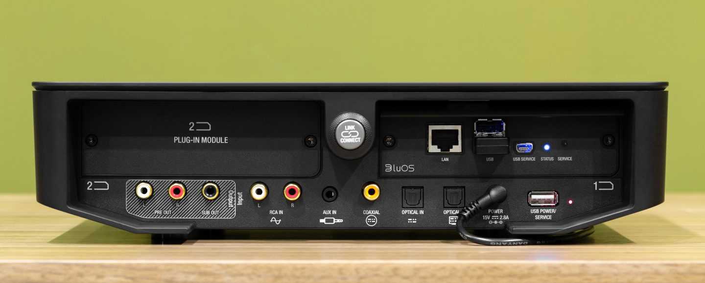 Поскольку радиоинтерфейс в колонках не поддерживает никакой связи ни с Bluetooth, ни с Wi-Fi, для подключения источников используется еще один компонент – Callisto Sound HUB. Выглядит он как предварительный усилитель с пультом ДУ и регулятором громкости. Но этот блок с двумя линейными входами (RCA и «джек») и тремя цифровыми (коаксиальный и два оптических), имеет даже по меркам преда подозрительно малый вес. В нем нет собственного трансформатора (питание осуществляется от адаптера), а начинка включает в себя самый современный модуль Bluetooth с aptX HD, коммутатор с ADC/DAC для аналоговых входов/выходов и упомянутый выше патентованный радиоинтерфейс с управляющим микроконтроллером. Т.е. перед нами на самом деле не пред, а точка для подключения и множественной раздачи сигнала с дуплексным каналом управления. Причем точка, допускающая функциональный апгрейд. В гнездо USB можно поставить «свисток» медиастримера Chromecast, а в один из двух сервисных отсеков на задней панели – модуль NPM-1 BluOS. При этом хаб превращается в мощное устройство, совместимое с одной из самых продвинутых мультирумных платформ. Вы получаете фирменный интерфейс управления Bluesound, подключение едва ли не ко всем известным стриминговым сетям и возможность проигрывания практически любых HiRes-файлов из локальных хранилищ.