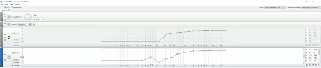 Более точно эквалайзер для наушников настроит утилита Equalizer APO. Дополнительно предназначена для переключения между пресетами. Создайте новую конфигурацию, укажите значения из таблицы и сохраните настройки.