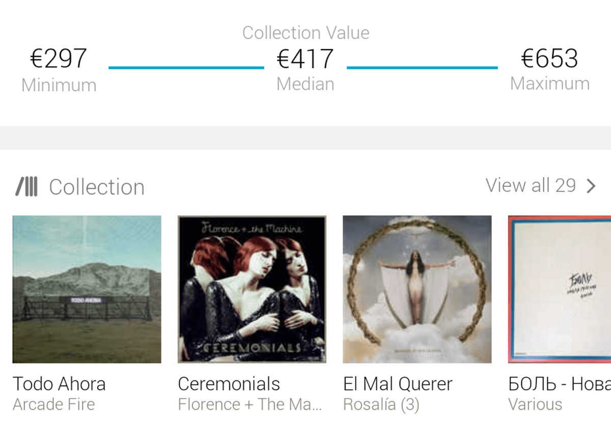 Моя небольшая коллекция из 29 пластинок оценивается сервисом Discogs в 297—653 €