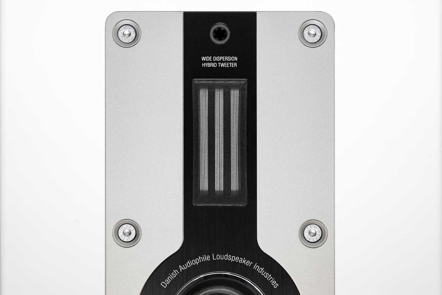 В характеристиках АС, данных производителем, число полос указано как 2,5+0,5. Сколько же это на самом деле? Если говорить простым и понятным языком, можно подойти формально и сказать, что их четыре, поскольку каждому из четырех имеющихся динамиков отведены различные частотные диапазоны. Просто они частично перекрываются — один низкочастотник работает до 800 Гц, а другой — до стыковки с высокочастотной секцией, которая приступает к делу с 2200 Гц. Она для DALI, можно сказать, традиционная, представляющая собой уже хорошо знакомый блок из купольного и ленточного твитеров, первый из которых обслуживает практически весь слышимый диапазон высоких частот, от упомянутых 2200 Гц до 20 кГц, а второй начинает ему помогать с 14 кГц.