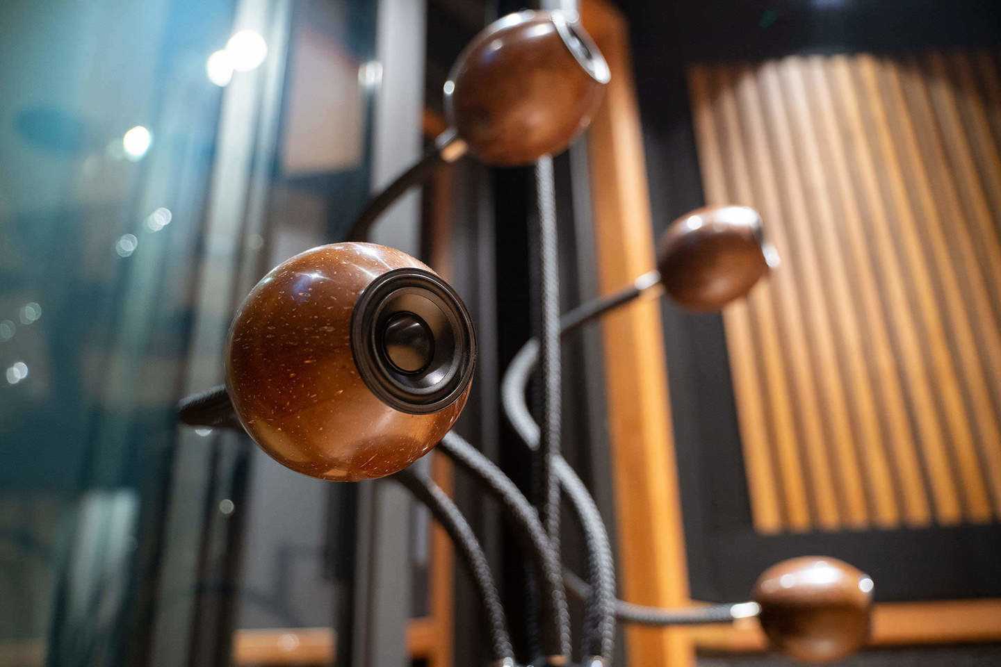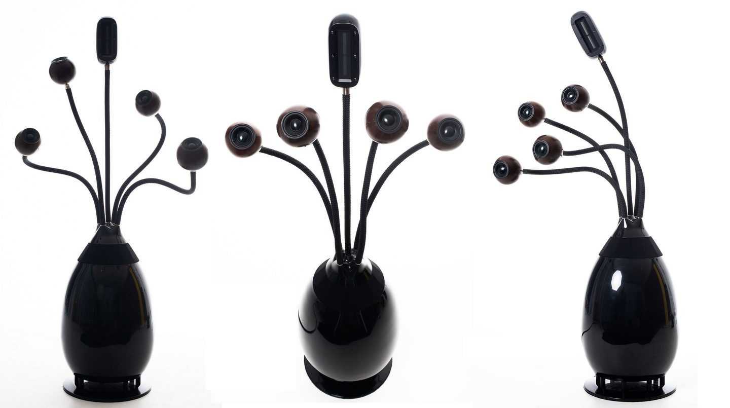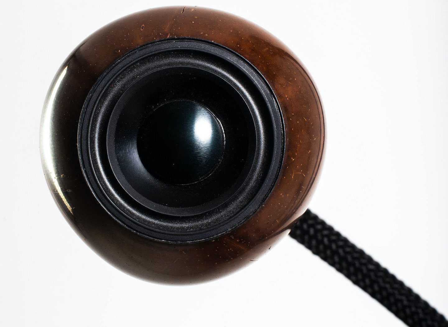 Затем в скорлупу кокоса устанавливают компактный, но мощный широкополосный драйвер с неодимовой магнитной системой, дополненной медным кольцом, охлаждаемой двойной голосовой катушкой и анодированным алюминиевым диффузором. Три таких кокоса устанавливаются на гибких гофрированных трубчатых штангах — наподобие тех, на которых часто устанавливают микрофоны в гарнитурах или источники света. Внутри крепления проходит акустический кабель, ну а сам «стержень» — очень жесткая и прочная, хотя и гибкая конструкция.