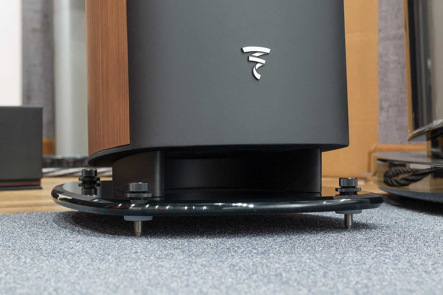 Фазоинвертор, как и у младшей модели, расположен на нижней скошенной поверхности, но направлен не в пол, а в основание акустики. Это основание сделано из 19-миллиметрового закаленного тонированного черного стекла. Установка возможна или на родные шипы, или на специальные ножки, не повреждающие покрытие пола. Отмечу, что опорные ножки проходят насквозь основания и заканчиваются массивными металлическими регулировочными ручками. Это, несомненно, удобнее, чем настройка при помощи ключа, и тем более удобнее тех случаев, когда отрегулировать шип можно только с нижней поверхности основания.