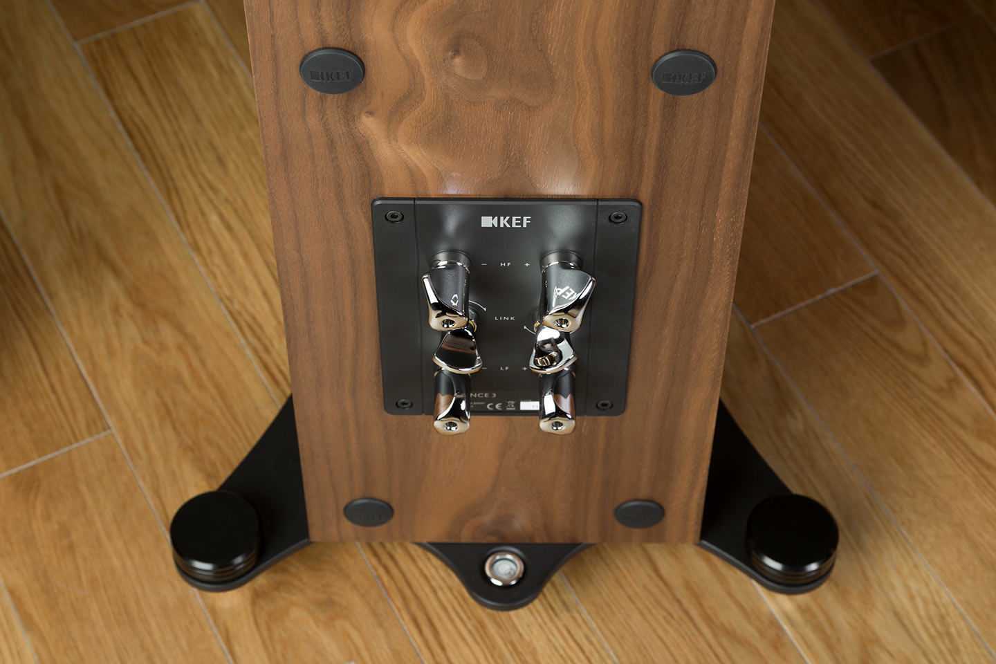 Колонки имеют акустическое оформление типа «фазоинвертор» и опираются на массивные металлические опоры со встроенными уровнями и регулируемыми по высоте шипами, от которых паркет и ковровые покрытия надежно защищают идущие в комплекте специальные металлические диски с углублениями. Корпуса изготовлены из плит полимерного композита, для большей жесткости стянутых винтами, ламинированных алюминием. Они изобилуют всевозможными перегородками, ребрами жесткости, устланы звукопоглощающим материалом и очень массивны. Неслучайно даже резкое постукивание не вызывает послезвучий, а значит, слушая KEF Reference 3, не стоит опасаться того, что в какой-то момент кабинет начнет аккомпанировать динамикам.