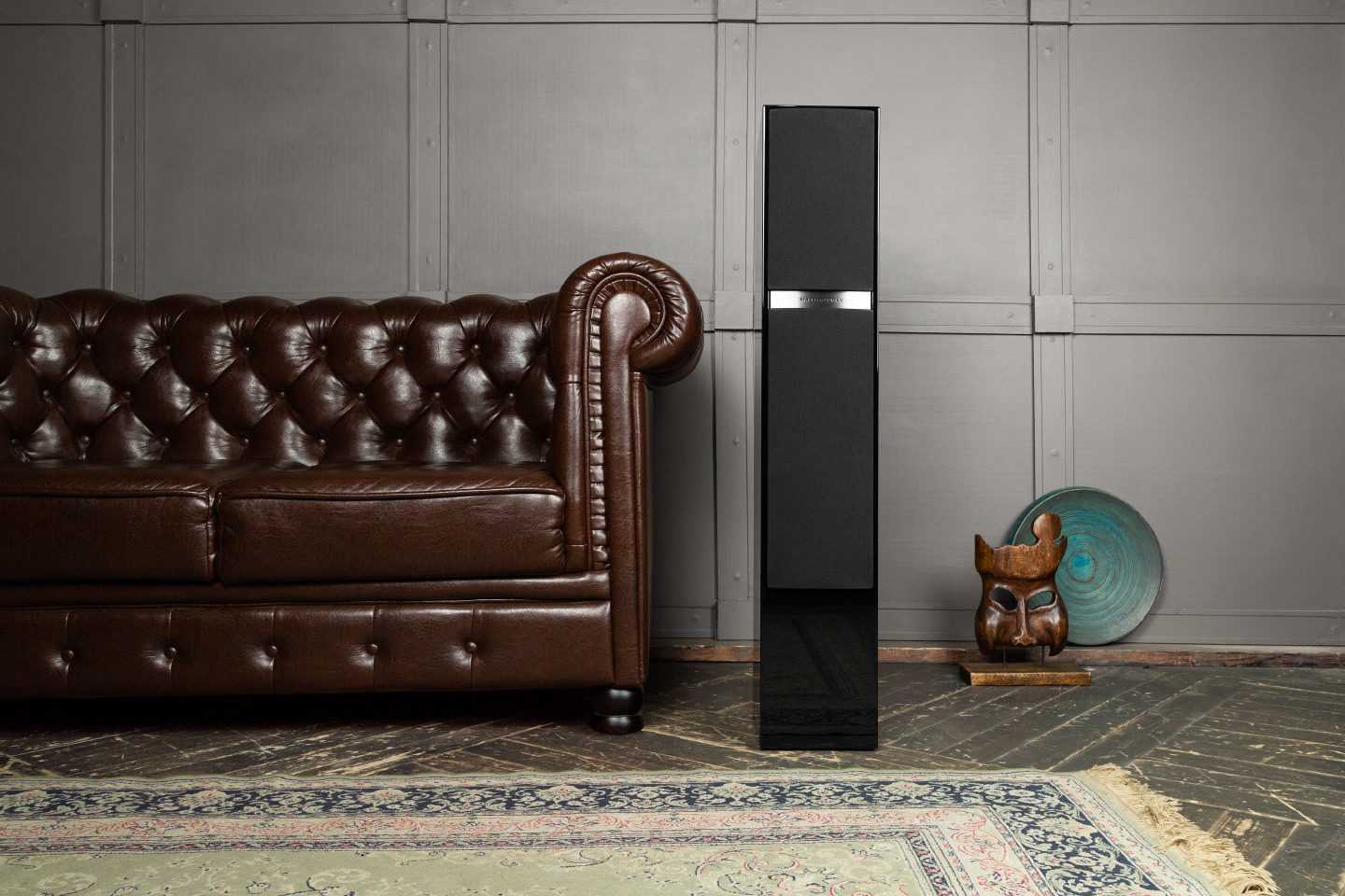 Среднечастотный динамик, помимо размера, отличается от НЧ-излучателей более жесткой конструкцией верхнего и нижнего подвесов. Это повышает его резонансную частоту и помогает достичь оптимальной АЧХ в заданном диапазоне. Пара низкочастотных динамиков расположена внизу колонки достаточно далеко от СЧ-излучателя. Такое решение позволяет минимизировать нежелательные отражения звука от пола и, как следствие, избавиться от гулкости и размытости звучания.